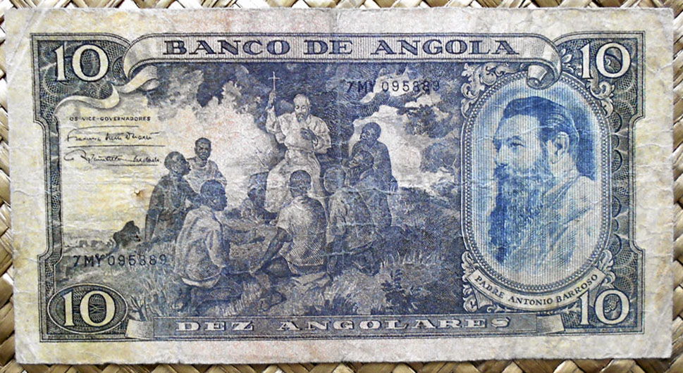 El billete de 10 angolares de Angola de 1946 muestra al Padre Antonio Barroso impartiendo formación religiosa en un encuentro con jóvenes angoleños, junto a un óvalo a la derecha con su rostro y torso ladeado. Antonio José de Sousa Barroso (1854-1918) fue un misionero portugués que impartió doctrina y ciencia en la colonia de Angola y en Mozambique. Llegaría a ser nombrado obispo de Oporto y ha sido proclamado venerable por el actual papa Francisco, teniendo pendiente su beatificación. Cromaticidad azul grisácea.