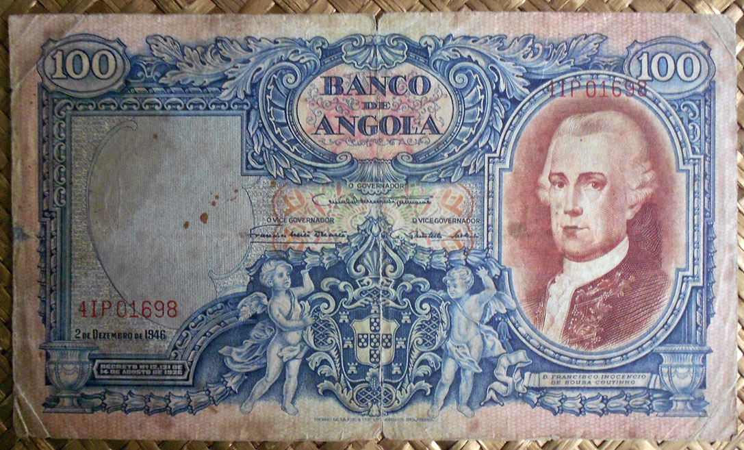 El billete de 100 angolares de Angola de 1946 nos muestra enmarcado a Francisco Inocencio de Souza Coutinho (1726-1780), Administrador, diplomático y militar en la colonia portuguesa del s. XVIII, que moriría en España siendo embajador en plaza. Le acompaña la representación clásica de dos querubines al pie central escoltando un barroco escudo de armas de Portugal. Todo en tonalidades azules resaltando el marco con el torso del héroe militar De Souza Coutinho con uniforme diplomático, en tonos marrones.