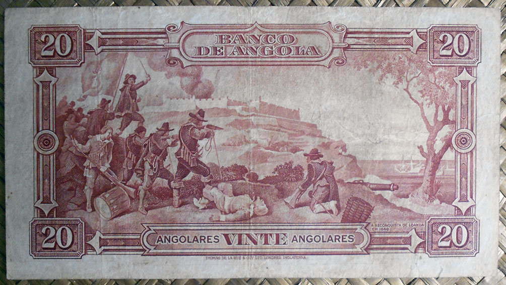 El billete de 20 angolares de Angola de 1944 nos ofrece al anverso un grabado de la Fortaleza de S. Miguel en San Paulo da Assumpçao –Luanda, junto a Salvador Correia de Sa e Benevides de cuerpo entero con atuendo de descubridor a la izquierda y su retrato en un óvalo a la derecha. Salvador Correia de Sa e Benevides (1602-1688) fue un soldado y político portugués que lucharía contra los holandeses en Brasil y en Angola, de la que sería designado gobernador. Luanda es actualmente la capital de Angola. Al centro superior se dibuja el escudo de armas de Angola colonial entre ramas de roble y de palma. Cromaticidad granate púrpura.