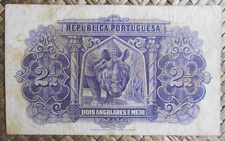 Su reverso nos ofrece un majestuoso rinoceronte entrando entre dos columnas clásicas bajo capiteles que soportan una cornisa con el texto “REPÚBLICA PORTUGUESA”. Coloración monocromática en tono púrpura. Al pie del grabado la empresa editora “Thomas de La Rue & Coy Ltd Londres Inglaterra”.