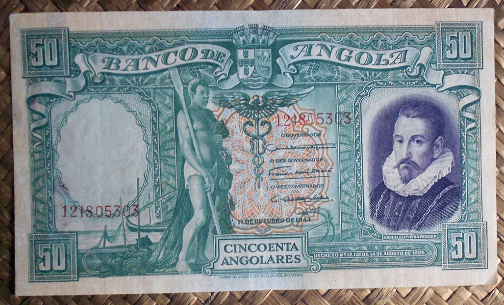 El billete de 50 angolares de Angola de 1944 nos ofrece al anverso a Manuel Cerveira Pereira en un óvalo a la derecha. Al centro la imagen de un nativo con un remo y redes de pesca; tras él una imagen de barcos a la orilla de un puerto y al centro del billete un caduceo y el escudo de armas de la Angola portuguesa. Manuel Cerveira Pereira fue un administrador colonial portugués y Capitán General de Angola en los inicios del s. XVII. En 1617 construiría la Fortaleza de Sao Filipe, que daría inicio a la fundación del asentamiento de Benguela, un nuevo dominio portugués al sur de Angola. Cromaticidad verde con el retrato en gris azulado.