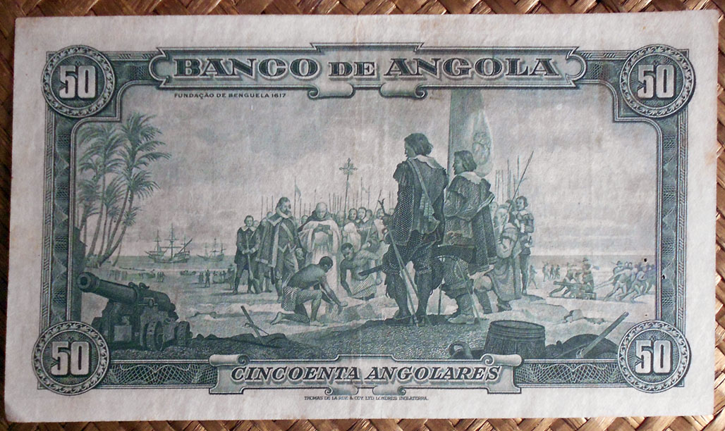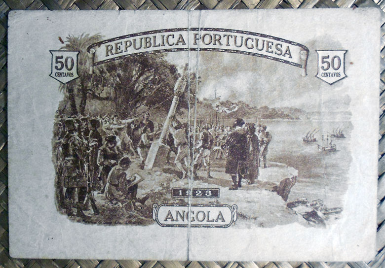 El billete de 50 centavos de peso de Angola de 1923 nos sorprende en su anverso con una artística composición con ciertos tintes de vasallaje. Bajo un pórtico clásico aparece sentada una dama blanca, alegórica de Portugal como potencia colonizadora, con una corona de laurel en sus manos y sobre un globo terráqueo, en alusión a su historia de conquistador alrededor del mundo. A su lado una joven nativa en actitud servil y enfrente dos nativos negros ofreciéndole viandas y frutas desde un paisaje de muelle portuario con grandes barcos atracados a lo lejos. Presidiendo el centro superior el escudo de Portugal sobre la esfera armillar y rodeado de ramas de laurel. Cromaticidad amarronada con textos en rojo.