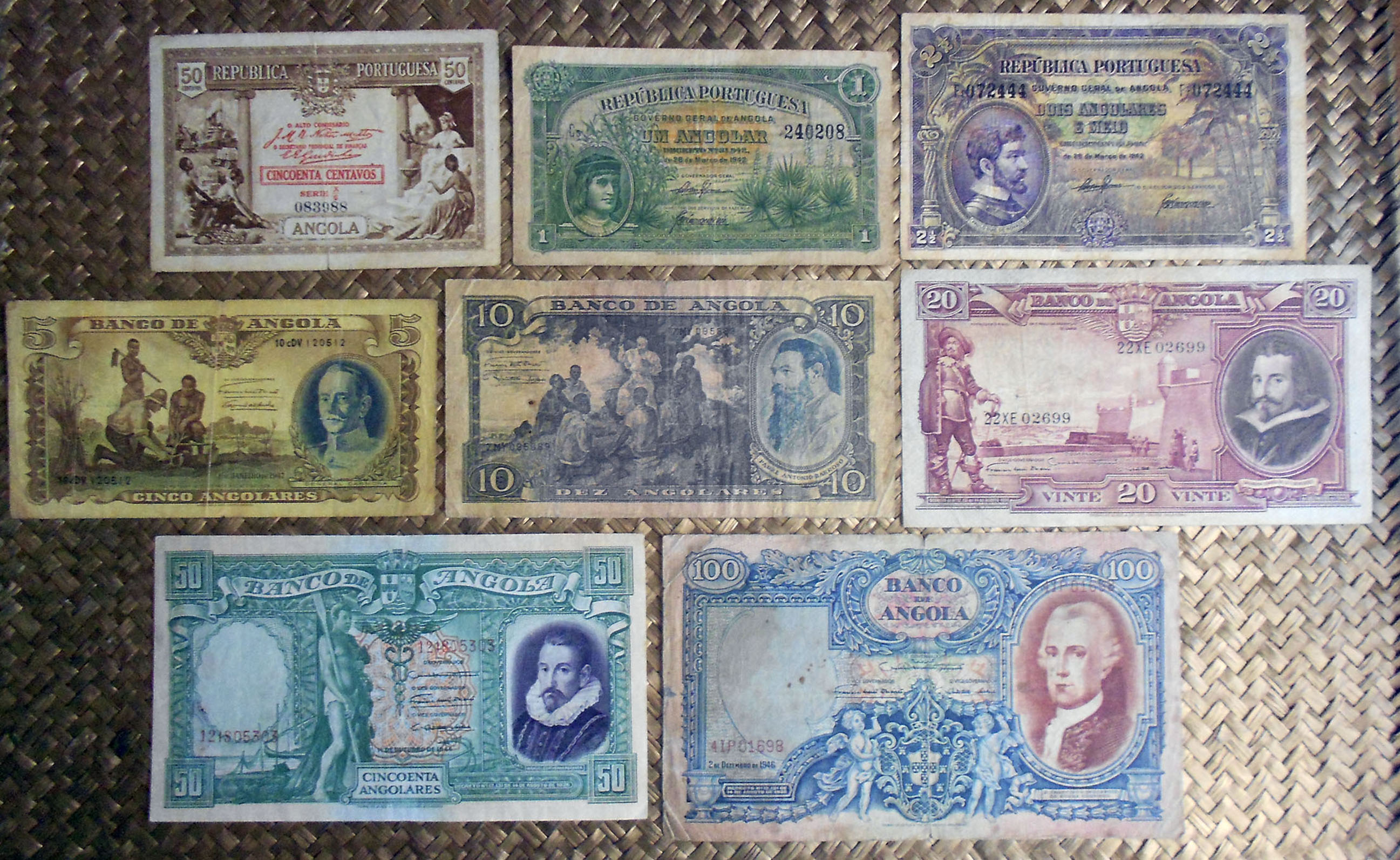 El billete de 1 angolar de Angola de 1948 nos ofrece una representación de desembarco de los conquistadores portugueses en las costas angoleñas, con las naos varadas y pequeñas barcas arribando a las playas. Es una edición conmemorativa del Tricentenario de la Recuperación de la colonia en 1648 por las tropas de Portugal, en mano de los holandeses desde siete años antes. Lleva la firma de José Agapito da Silva Carvalho como O Governador Geral.