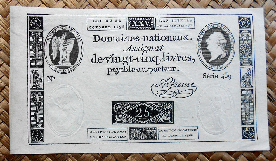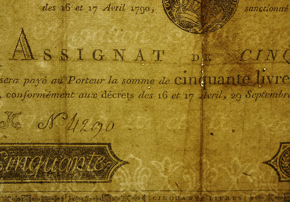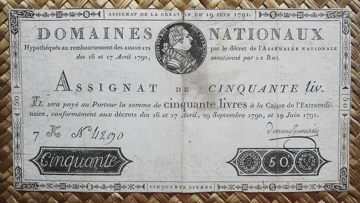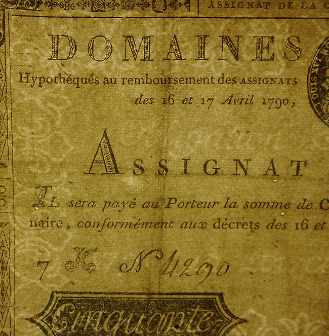 Los assignats se crearon incialmente como bonos para estimular la economía francesa y avanzar en el pago de la deuda, pero pronto se iban a convertir en moneda de curso legal, en detrimento de la moneda metálica (plata principalmente). El recelo de la sociedad al cambio de plata por papel se combatió con el respaldo del papel moneda con propiedades de gran valor y la consigna de que apoyar los assignats era apoyar la revolución. Pero la inflación no perdona para un valor no garantizado por un Banco sino por el propio gobierno revolucionario; el valor de la moneda caía y el déficit nacional aumentaba. Paralelamente se incrementaban las emisiones de assignats, que irían acompañadas de nuevas confiscaciones, incautación de propiedades y de tierras.