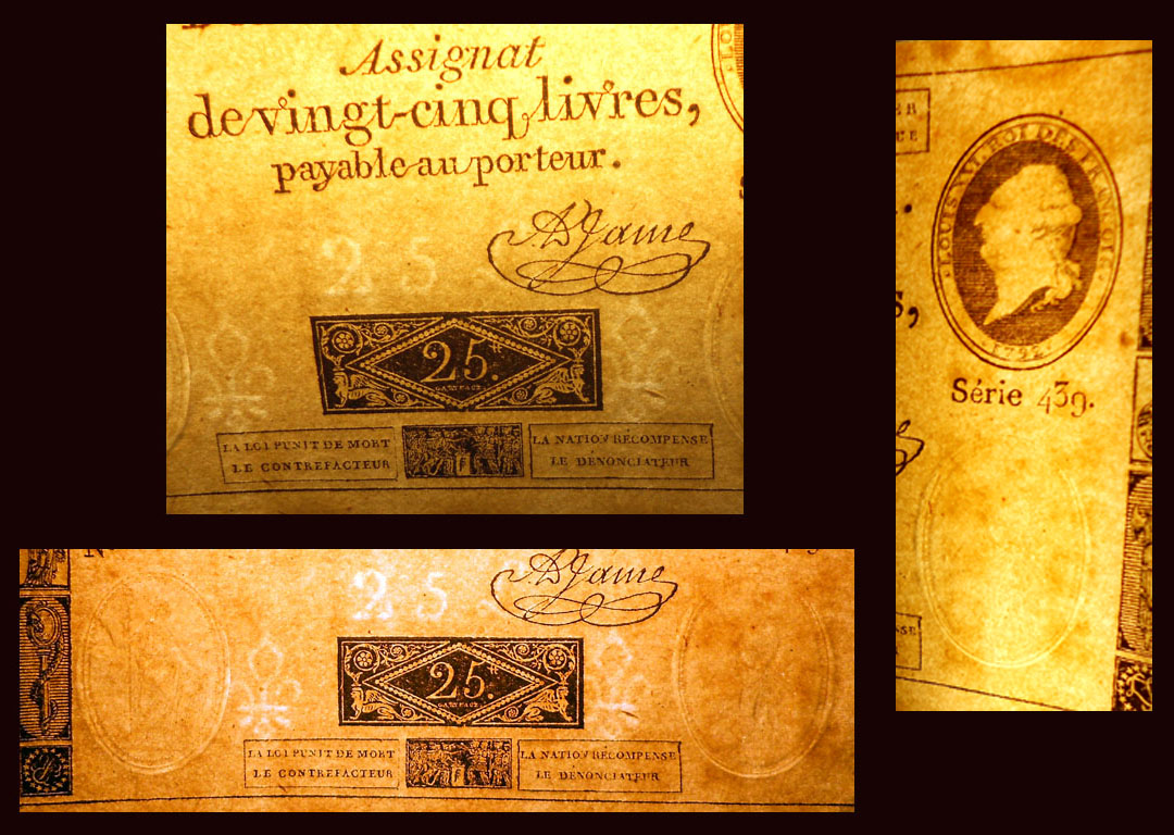 Este billete mantenía la expresión que encabezó las emisiones anteriores de billetes en livres, sous y sols desde 1791, “Hypothéque sur les domaines nationaux” (Hipotecado sobre los bienes nacionales), ya que mantenían su respaldo en las propiedades nacionales, principalmente las confiscadas por la Asamblea Nacional de la República, tanto a la Corona como la la Iglesia, y de las tierras incautadas a emigrantes huidos. Vemos el texto en la cartela que se imprime en el centro superior del ejemplar.