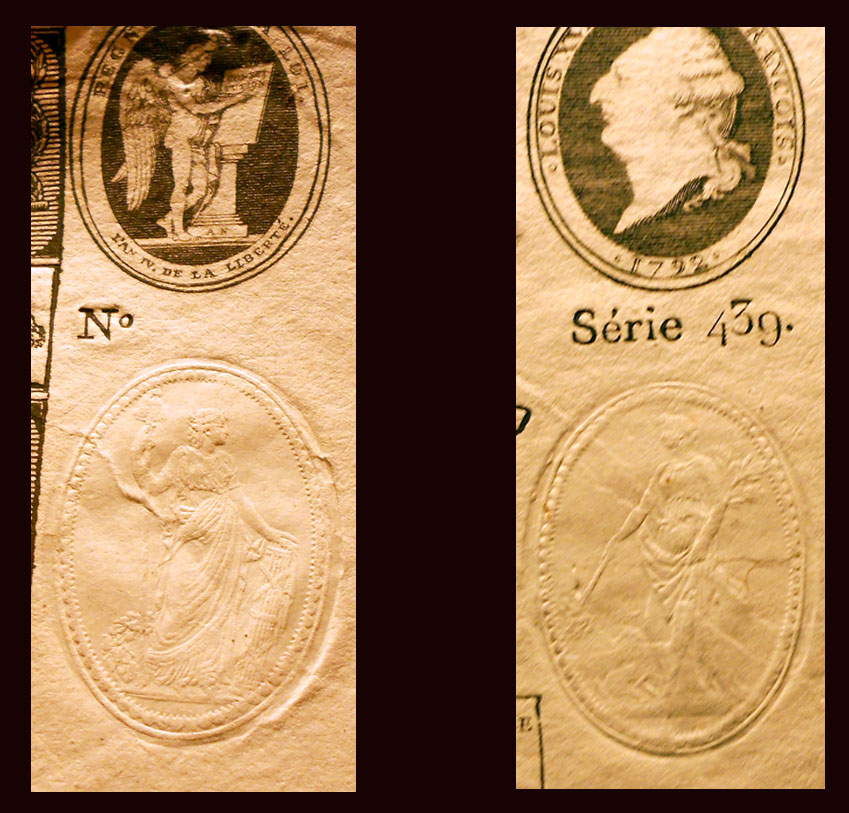 El sello en seco, que aparece en el tercio inferior derecho, representa al Pueblo francés a través de Hércules, con un garrote y una rama de olivo acompañado de la Libertad, apoyada en una pica y sujetando con su mano izquierda el gorro frigio. Todo rodeado de una inscripción circular: «REPUBLIQUE FRANCAISE«.