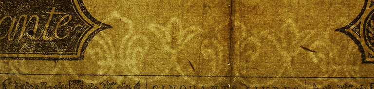 Su marca de agua nos representa un gorro frigio y un triángulo en los laterales superiores, la inscripción «100” (en filigrana oscura) al centro, la inscripción “Francs” (en filigrana clara) al pie y un disco circular (en filigrana oscura) bajo el sello en seco.