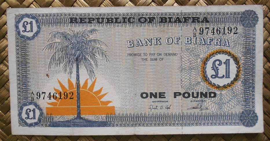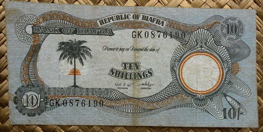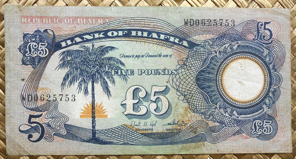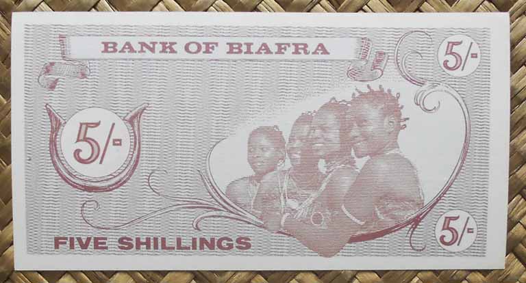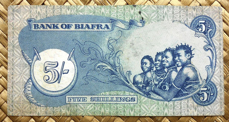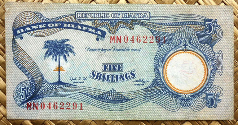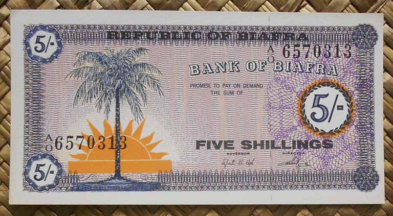 El billete de 5 chelines de Biafra de 1967 muestra al anverso la palmera sobre medio sol con los once rayos; al reverso vemos cuatro jóvenes igbo (etnia biafresa) en su derecha y a la izquierda un disco con el valor en nº dentro de una manilla (óvalo lobular de cobre que se usaba primitivamente como dinero). Cromaticidad gris, naranja y rosácea.