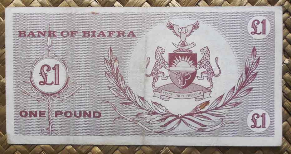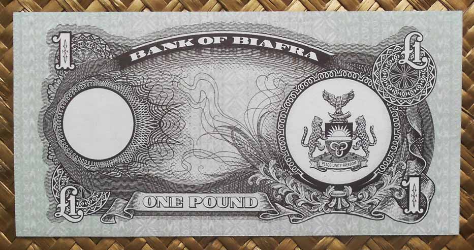 El billete de 1 libra de Biafra de 1967 nos vuelve a mostrar la composición del anverso anterior. Para el reverso nos guarda, a su derecha el escudo de armas biafrés sobre dos ramas de laurel, y a su izquierda una lanza ceremonial (“alo” en la etnia igbo, como cetro de poder) soportando el disco con el valor del billete. Cromaticidad gris, naranja y granate clara.
