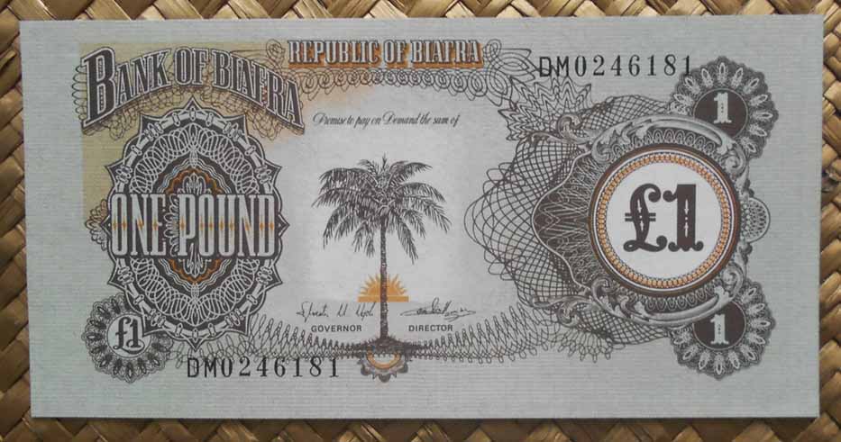 El billete de 1 libra de Biafra de 1968-69 mantiene la palmera y el sol, presidiendo su anverso en el interior de un elaborado patrón de curvas, con rosetas y cicloides mucho más vistosas que la primera serie. Para el reverso, en la misma línea de composición, solo mantiene el escudo de armas como viñeta sobre unos ramos de laurel entrecruzados. Cromaticidad en grises y verdes.