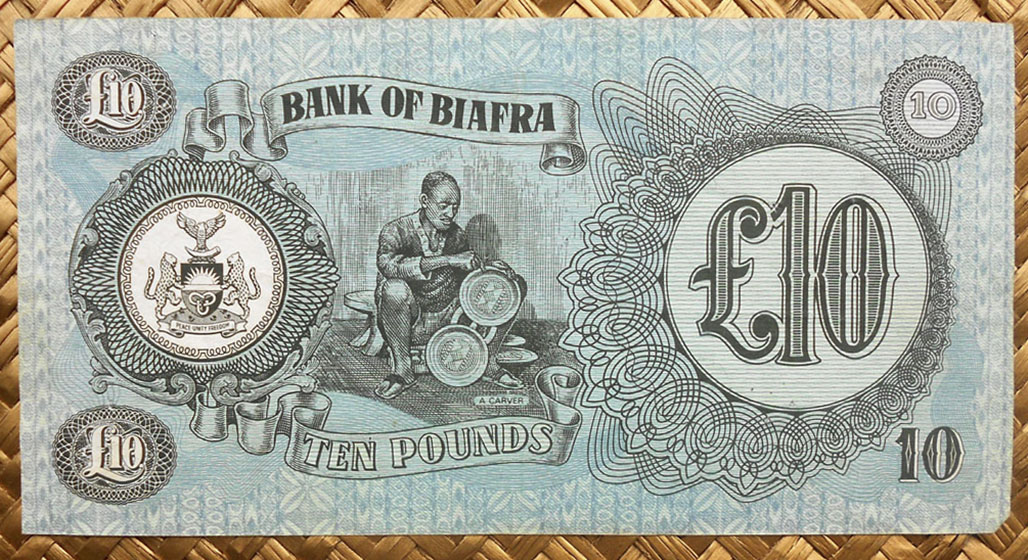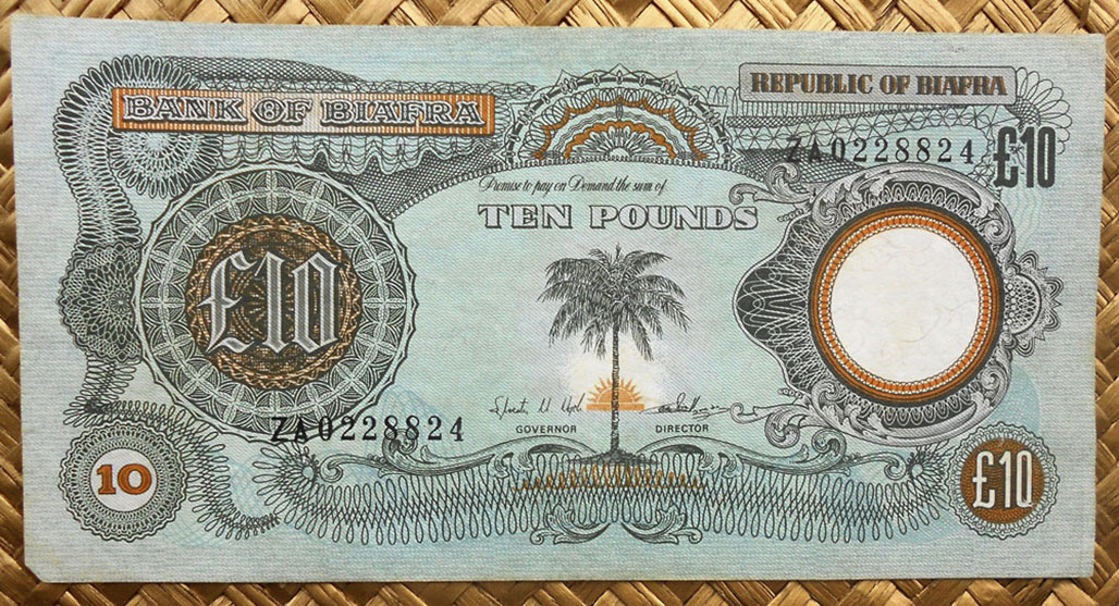 El billete de 10 libras de Biafra de 1968-69 muestra un anverso con otro patrón distinto pero en la misma línea de composiciones que los anteriores, en tonalidades verde-azuladas con tonos cálidos y marrones. La palmera y el sol recuperan el tamaño del billete de 1£.