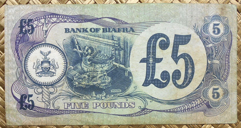 El billete de 5 libras de Biafra de 1968-69 muestra un anverso con un patrón semejante en trazos pero de distinta composición, mayor colorido (grises, naranjas y verdes) y con la palmera y el sol de mayor tamaño; también muestra el valor del billete “£5” en texto sobredimensionado al centro. El reverso nos recupera la lanza de ceremonia o “alo”, esta vez sujetando el disco con el escudo de armas; a su lado una hilandera en su telar y otro disco con el valor del billete en tamaño grande y con grecas interiores.