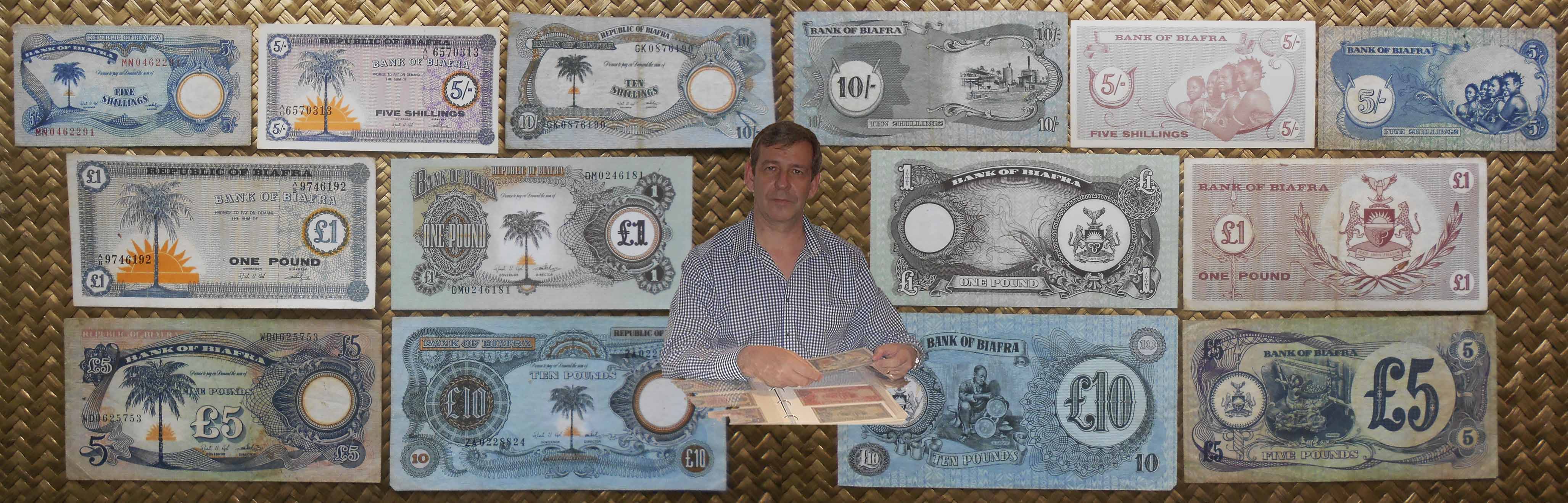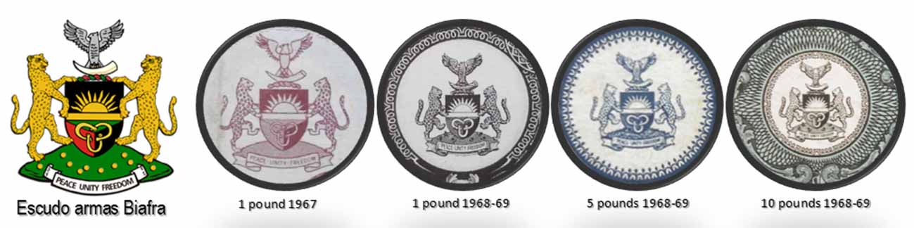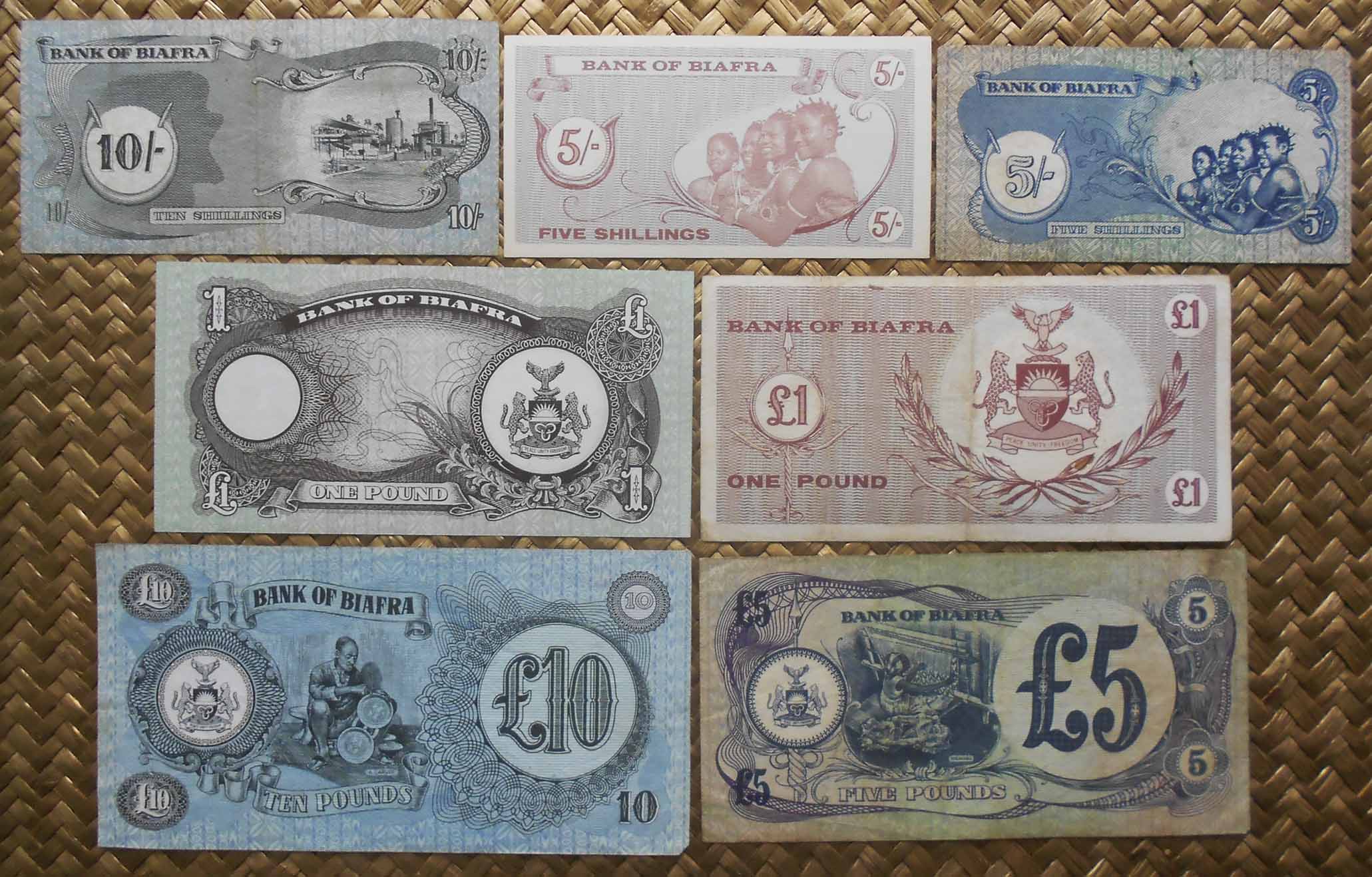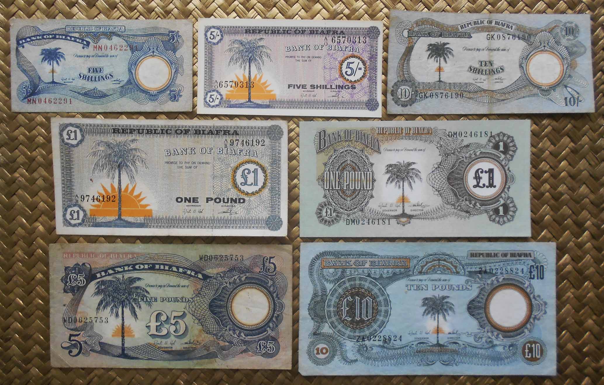 Durante este breve período de independencia (más bien de guerra civil) se emitieron dos series de billetes como papel moneda. Revisaremos la primera emisión, de 1967, con los valores de 5 chelines y 1 libra, y la segunda emisión, de 1968-69, con los valores de 5 y 10 chelines y 1, 5 y 10 libras.