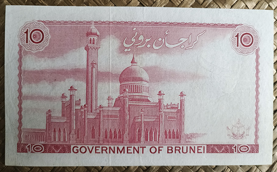 Para los reversos nos ofrecen una vista de la Mezquita Omar Ali Saifuddin, erigida en su honor en 1958 en la Bandar Seri Begawan, capital de Brunei. Simbolo de la fé islámica del país, lleva el nombre del 28º sultán de la dinastía, Omar Ali Saifuddin III, padre del actual monarca. En 1967, sobre el lago artificial que la rodea y frente a su entrada principal, (en la parte posterior del grabado) se construyó una gran barcaza de piedra a modo de réplica de la que utilizó el sultán Bolkiah Mahligai en el s. XVI. La barcaza se erigió en conmemoración del 1.400 aniversario del Nuzul Al-Quran (día de la revelación del Corán). Este monumento, aunque coetáneo con la emisión, no fue plasmado en la viñeta, aunque puede contemplarse desde entonces. La viñeta de los reversos se completa con el escudo de armas del país, que aparece en la esquina inferior derecha de los mismos.