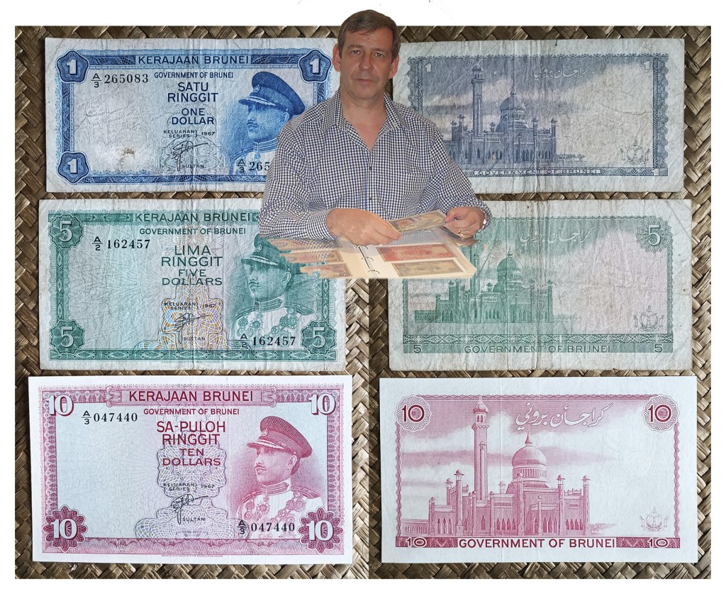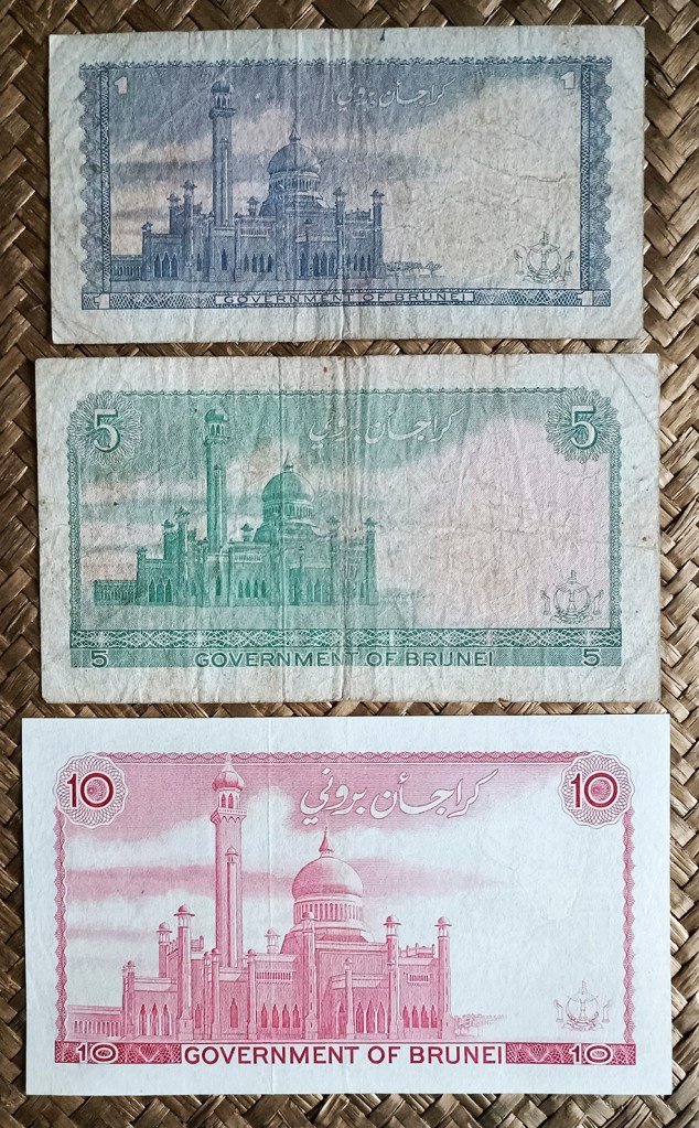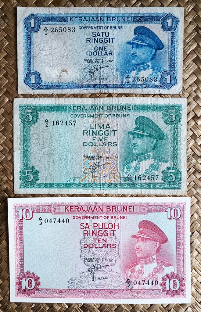 Contemplaremos los billetes de Brunei de 1, 5 y 10 ringgit (o dólar bruneano) de 1967. Esta sería la 1ª emisión de billetes tras abandonar la Junta de Comisionados de Malaya y Borneo Británico (Board of Commissioners of Currency Malaya & British Borneo) en 1967. La evolución monetaria durante el Protectorado la revisamos anteriormente en “Dólares de Straists Settlement, Sarawak, Malaya & British Borneo”.