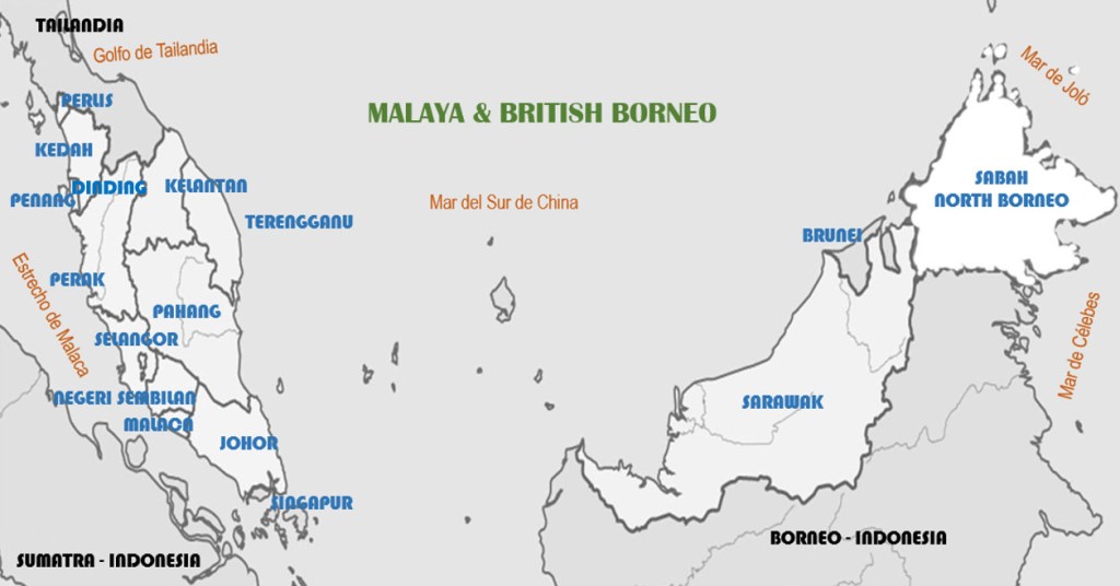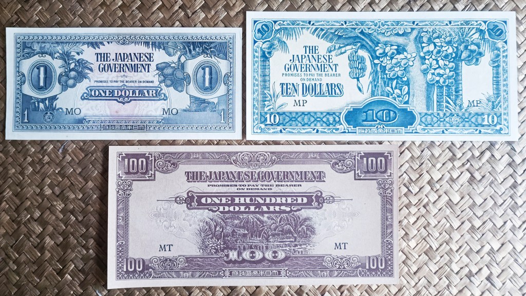 Ya mencionamos antes la etapa en que este territorio, junto al resto del sureste asiático, estuvo en manos japonesas. Sería entre diciembre de 1941 y agosto de 1945 cuando las tropas niponas se hicieron fuertes en Indochina, Malaya, Borneo, Birmania, Indonesia y Filipinas. Concretamente en Malaya y Borneo (Sarawak, Brunei, Sabah, …) la moneda local fue reemplazada por el dólar del Gobierno japonés o duit pisang (conocido como dinero bananero por sus viñetas). Vemos unos ejemplares de esta ocupación, los billetes de 1, 10 y 100 dólares de 1942-1944.