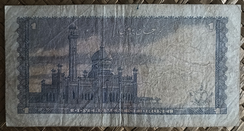 El ejemplar de 1 ringgit de Brunei de 1967 nos muestra al sultán Omar Ali Saifuddin y su mezquita homónima en cromaticidad predominante azulada en anverso y azul grisáceo en el reverso.