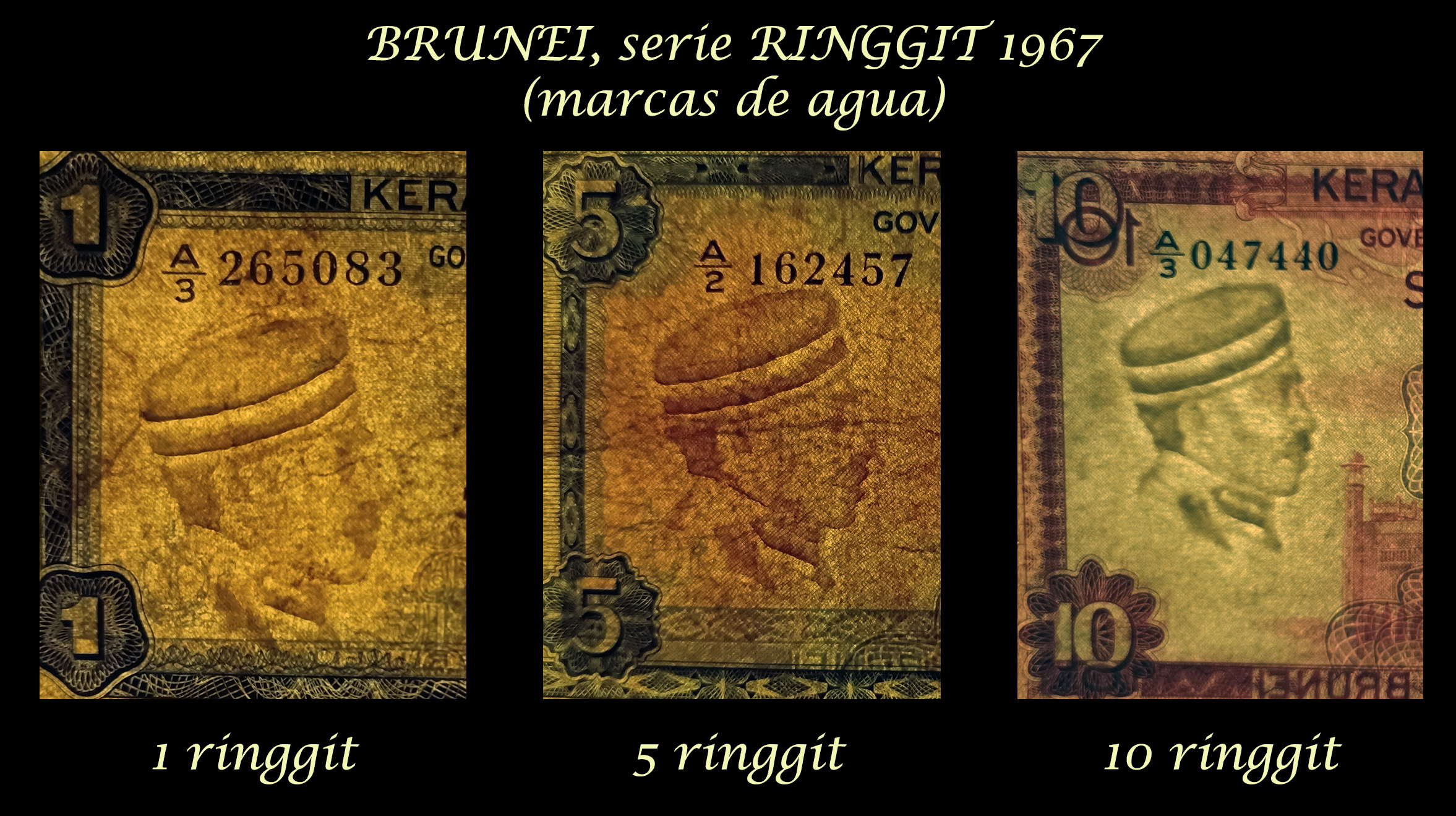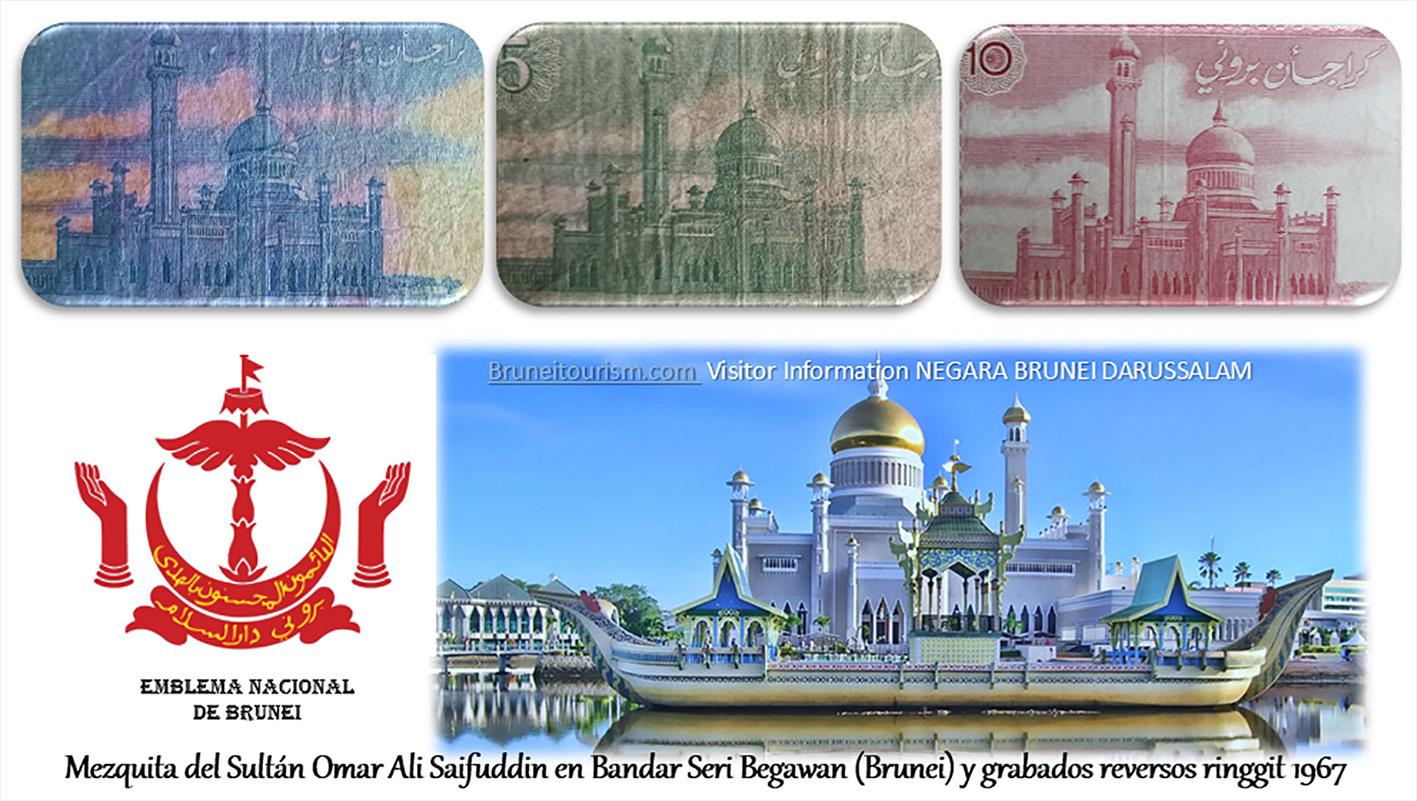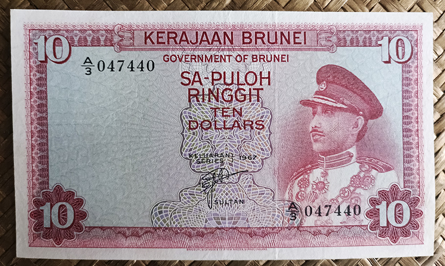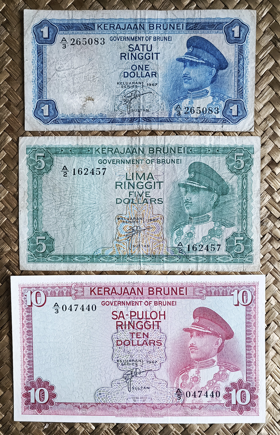 Contemplaremos los billetes de Brunei de 1, 5 y 10 ringgit (o dólar bruneano) de 1967. Esta sería la 1ª emisión de billetes tras abandonar la Junta de Comisionados de Malaya y Borneo Británico (Board of Commissioners of Currency Malaya & British Borneo) en 1967. La evolución monetaria durante el Protectorado la revisamos anteriormente en “Dólares de Straists Settlement, Sarawak, Malaya & British Borneo”.