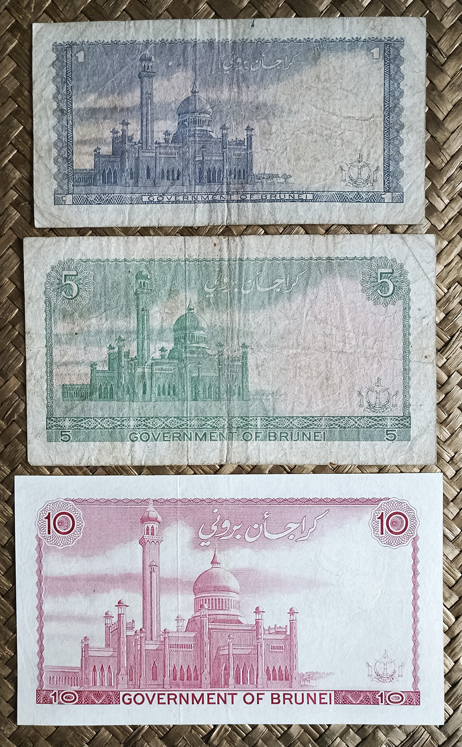 Para los reversos nos ofrecen una vista de la Mezquita Omar Ali Saifuddin, erigida en su honor en 1958 en la Bandar Seri Begawan, capital de Brunei. Simbolo de la fé islámica del país, lleva el nombre del 28º sultán de la dinastía, Omar Ali Saifuddin III, padre del actual monarca. En 1967, sobre el lago artificial que la rodea y frente a su entrada principal, (en la parte posterior del grabado) se construyó una gran barcaza de piedra a modo de réplica de la que utilizó el sultán Bolkiah Mahligai en el s. XVI. La barcaza se erigió en conmemoración del 1.400 aniversario del Nuzul Al-Quran (día de la revelación del Corán). Este monumento, aunque coetáneo con la emisión, no fue plasmado en la viñeta, aunque puede contemplarse desde entonces. La viñeta de los reversos se completa con el escudo de armas del país, que aparece en la esquina inferior derecha de los mismos.
