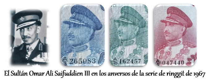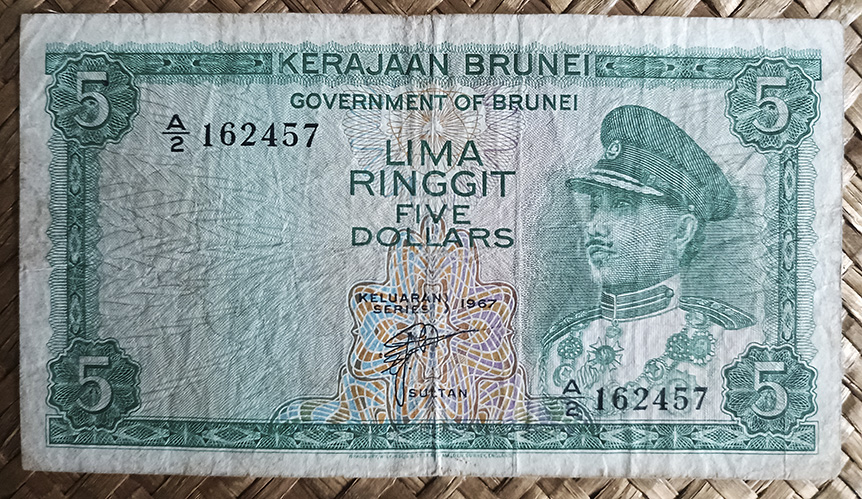 Omar Ali Saifuddien III (Omar Ali Saifuddien Sa’adul Khairi Waddien III; 1914-1986) gobernaría como sultán de Brunei entre 1950 y 1967, año en que abdicó en su hijo Muda Hassanal Bolkiah. En la década de los ’80, ya con su hijo como sultán, fue Ministro de Defensa hasta su fallecimiento en 1986. Se le reconoce como el arquitecto del Brunei moderno y padre de la independencia. Solo aparecería en este billetario de 1967, precisamente el año de su abdicación. Las ediciones posteriores rendirán culto a su hijo, que aparecerá presidiendo los billetarios bruneanos del resto del siglo XX.