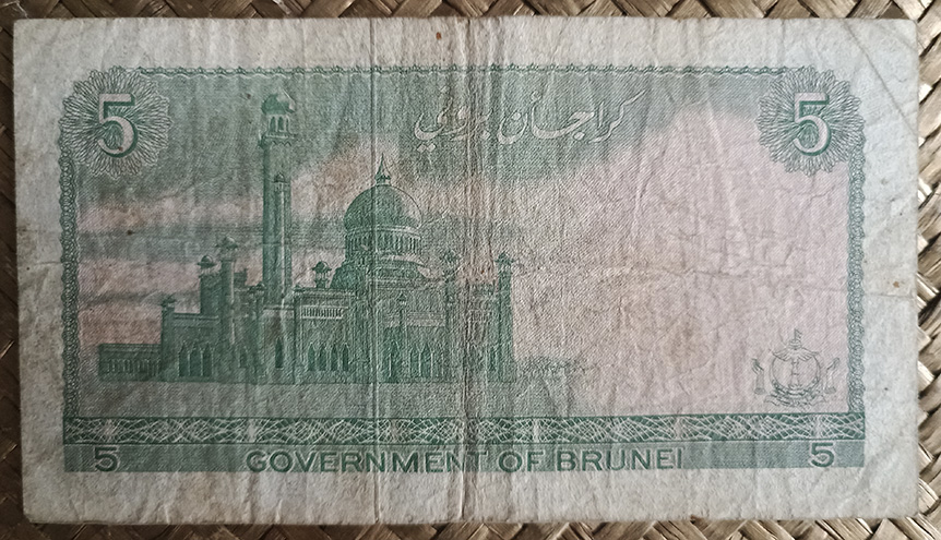 El billete de 5 ringgit de Brunei de 1967 nos ofrece al sultán 28º de la dinastía y su mezquita de la capital en tonos predominantes verdosos, tanto anverso como reverso.