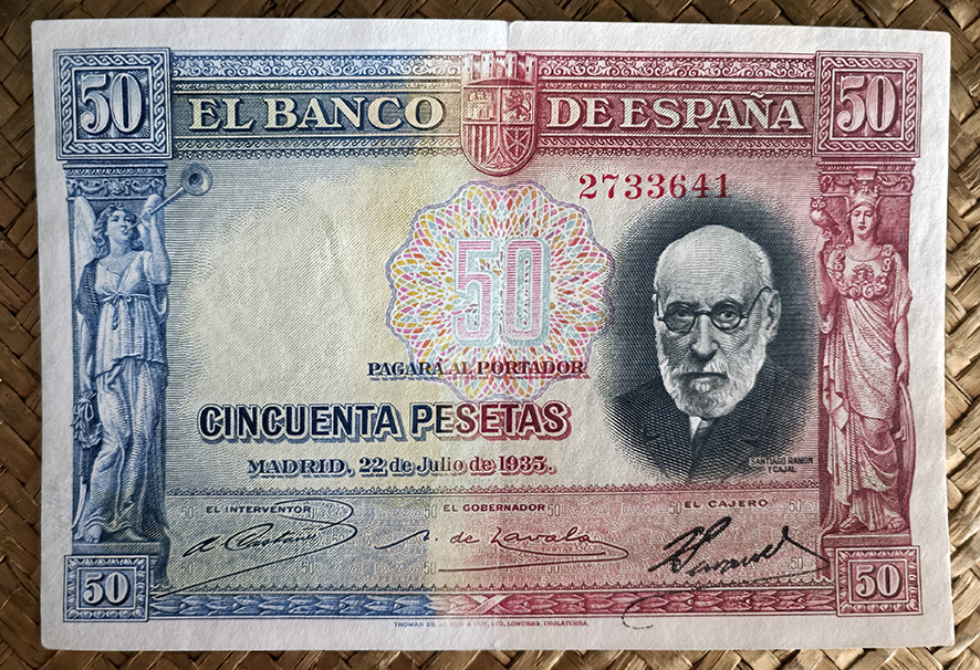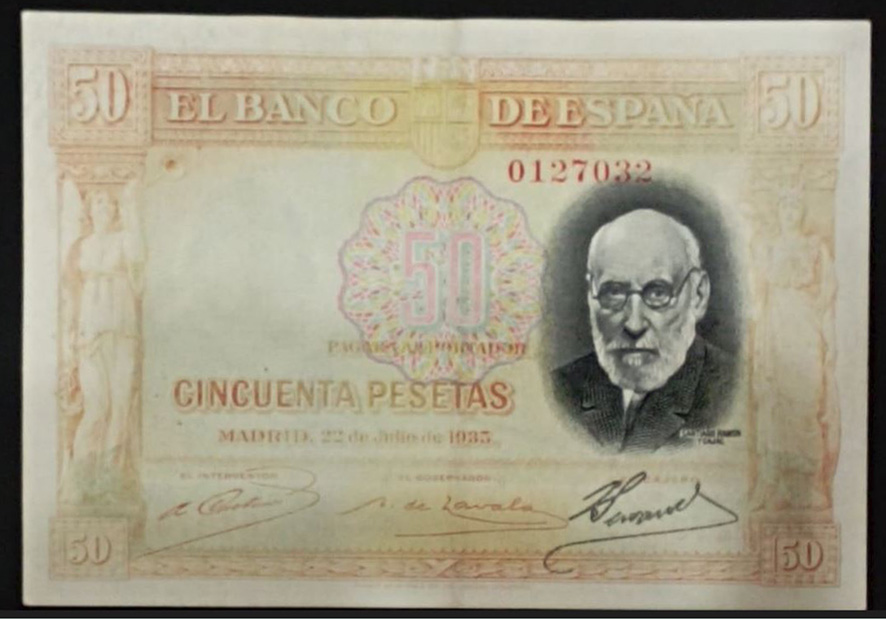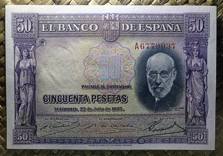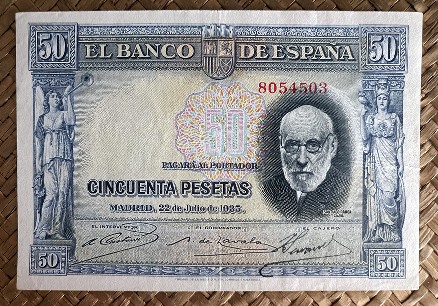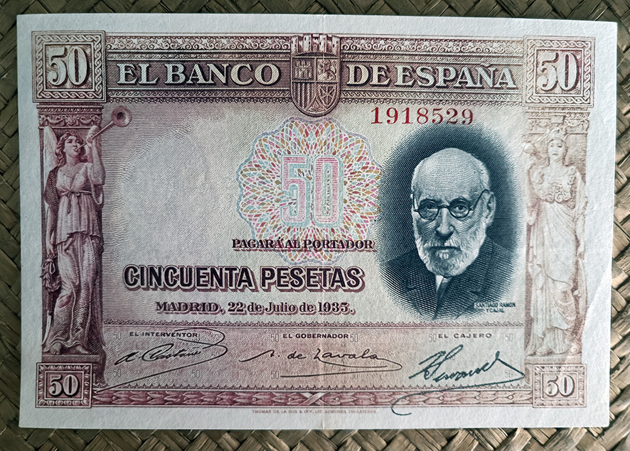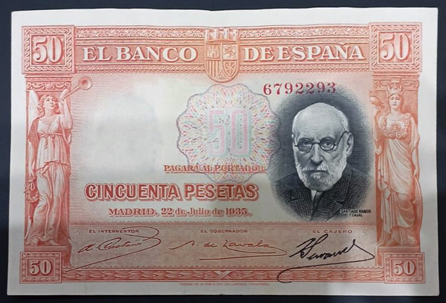 Desde “Miscelánea” nos centraremos en el billete de 50 pesetas de 1935, emitido por el Banco de España con el Gobierno de la II República. Este ejemplar fue dedicado al ilustre investigador Santiago Ramón y Cajal apenas un año después de su fallecimiento.