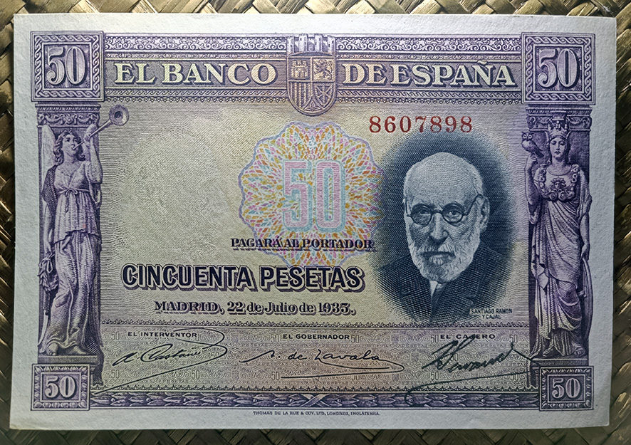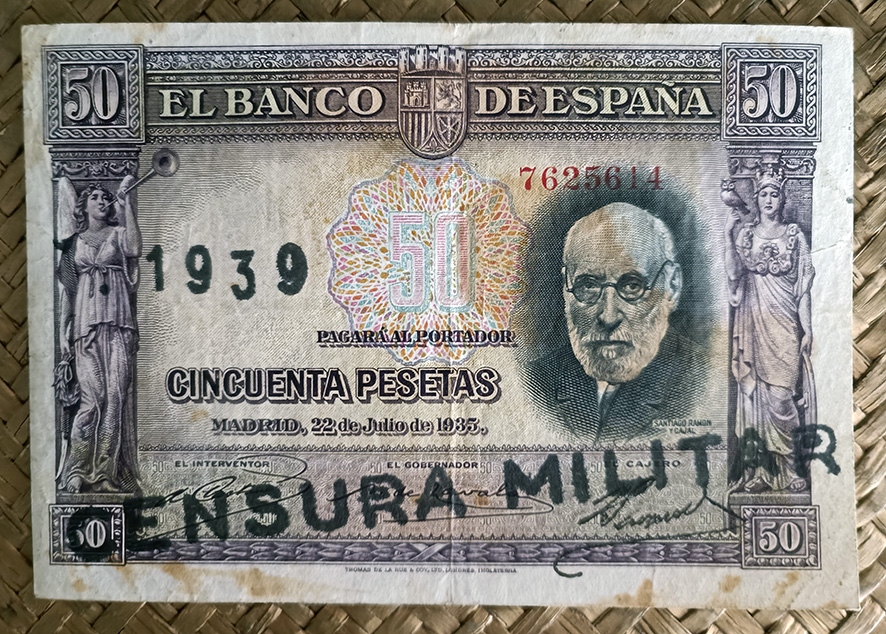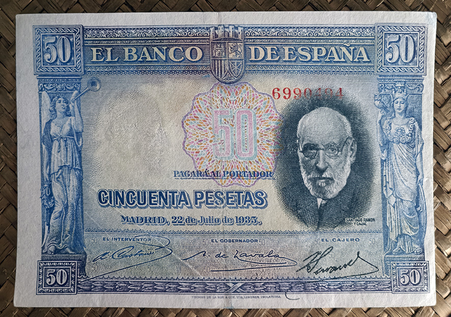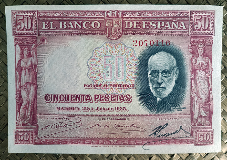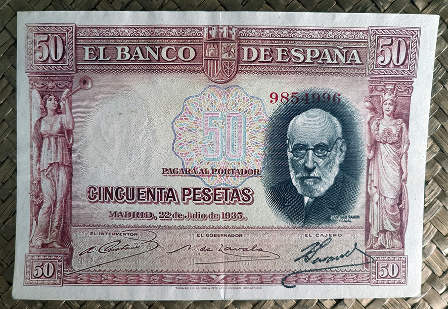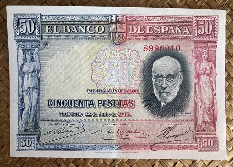 Desde “Miscelánea” nos centraremos en el billete de 50 pesetas de 1935, emitido por el Banco de España con el Gobierno de la II República. Este ejemplar fue dedicado al ilustre investigador Santiago Ramón y Cajal apenas un año después de su fallecimiento.