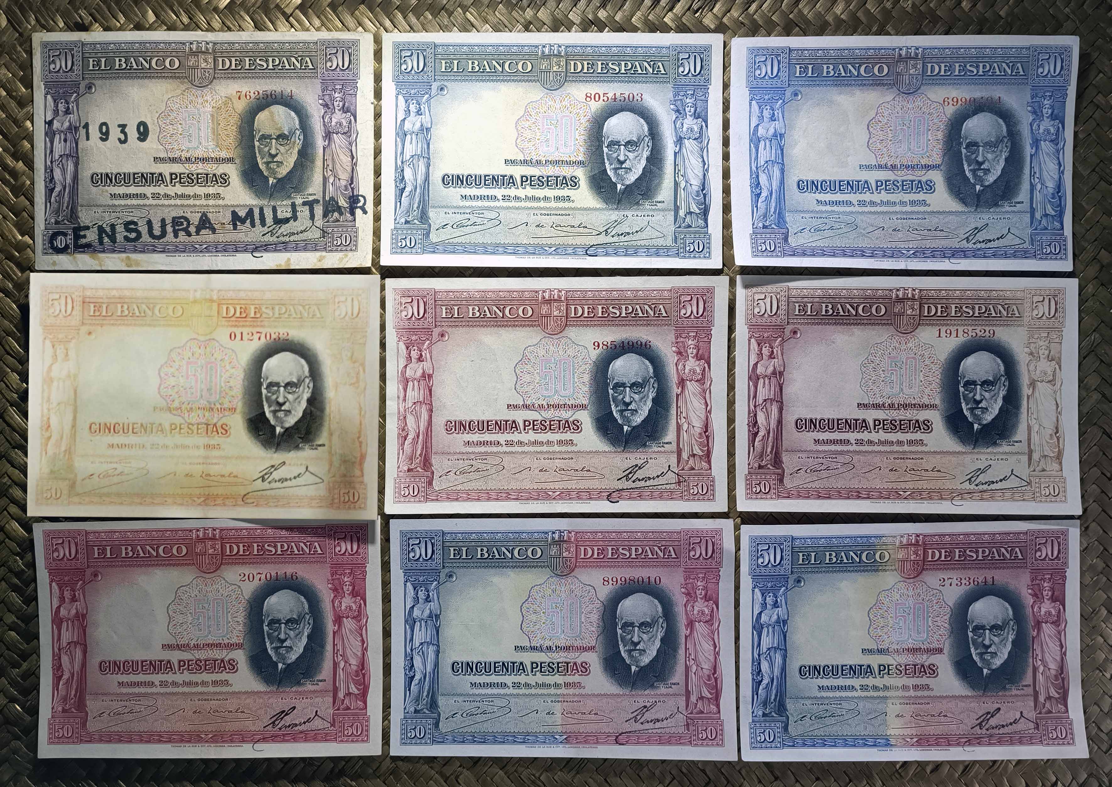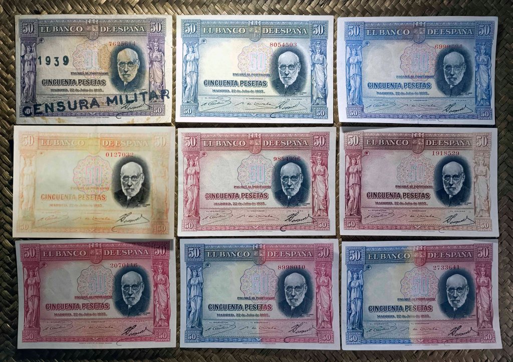Para el anecdotario notafílico nos queda el ejemplar más manipulado del billetario español, alterado químicamente con casi todas las coloraciones visibles (¡menos el verde!). ¡Qué casualidad que estaba dedicado a nuestro ilustre investigador Ramón y Cajal, un experto en la aplicación de la química y el uso de tintas para el progreso de la Humanidad, …y no para el engaño!