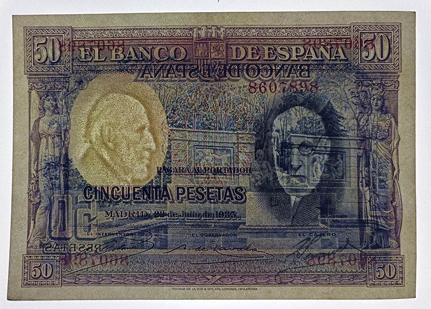 El billete elegido, editado con fecha de 1935, no salió a circulación hasta 1938, en plena guerra civil y con el Gobierno republicano en “franco” retroceso. Por lo que su periplo como billete en circulación no llegó a cumplir el año. Impreso por la empresa inglesa Thomas de la Rue & Co. Ltd. de Londres, su grabador fue Camilo Delhom.