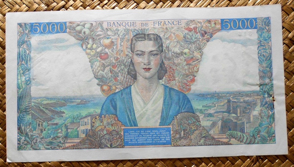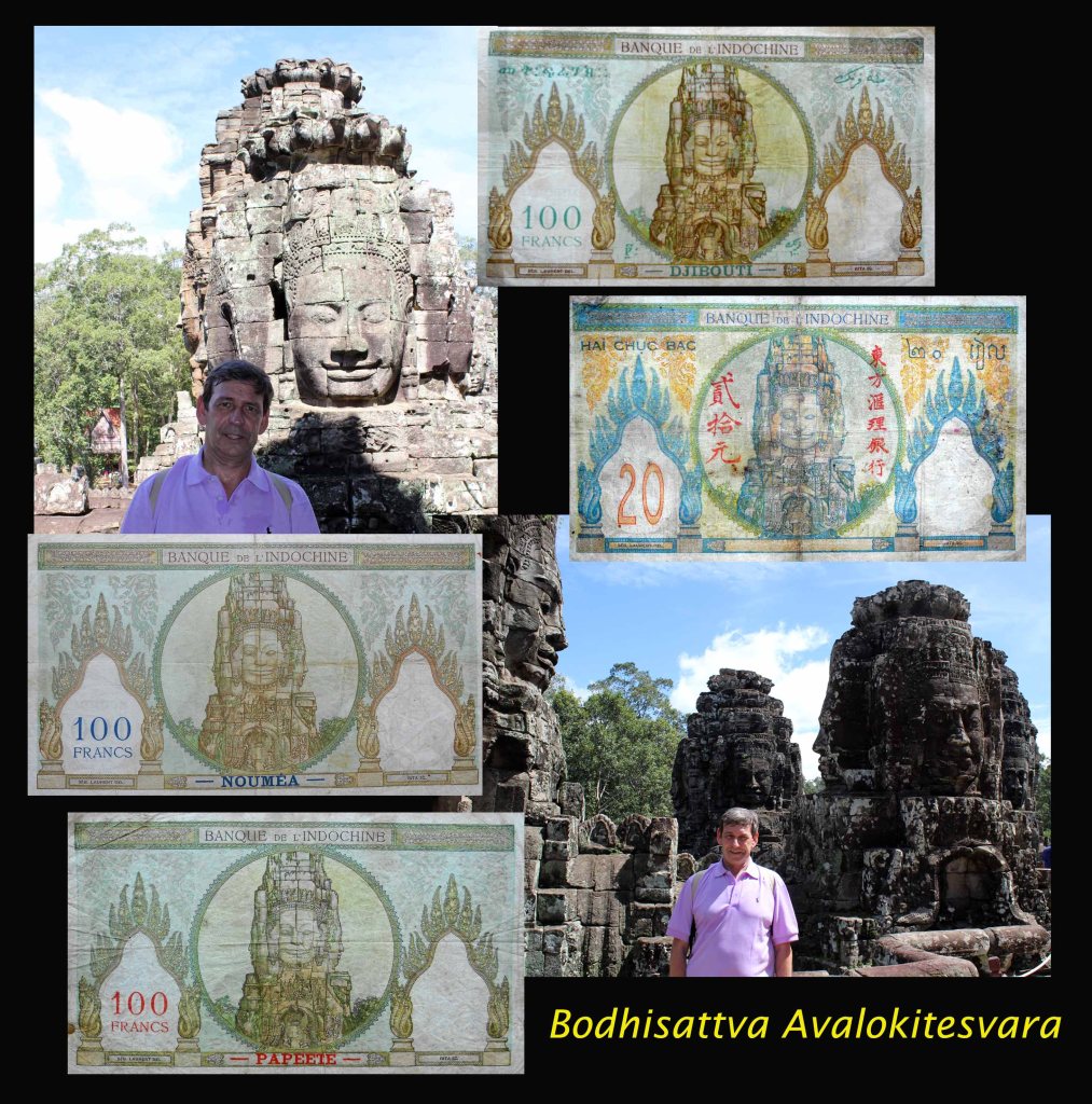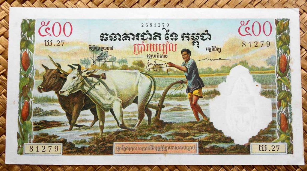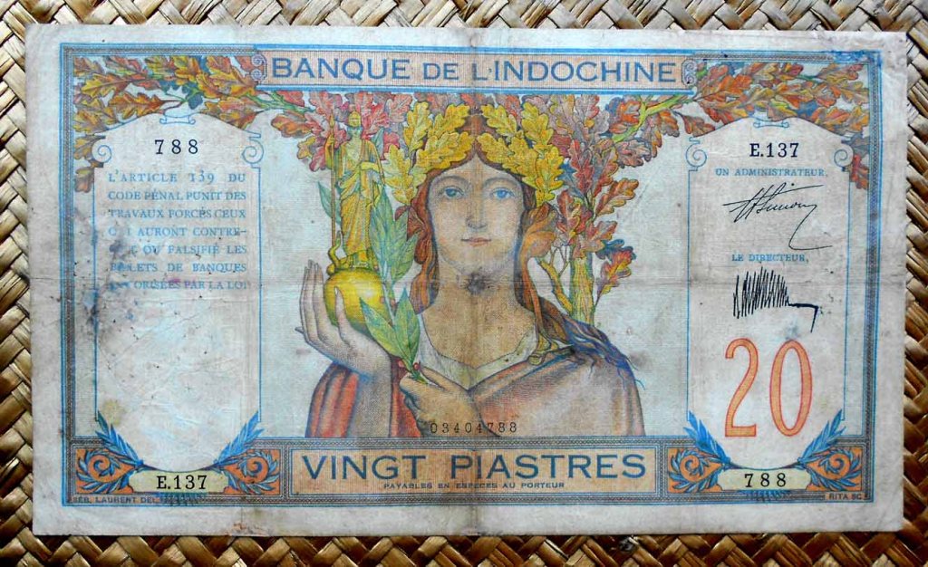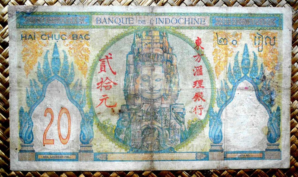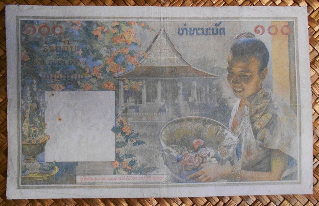 Esta obra de arte hecha billete salió de los lápices de Marcel-Louis Leguay (1910-2001), artista francés afincado en Laos, después de haber pasado por Saigón (actual Ho Chi Minh). De hecho se casó con una bella laosiana, que inmortalizaría en el billete que revisamos. También fundó a finales de los años ’50 la primera academia de Bellas Artes en Vientian, la capital de Laos.