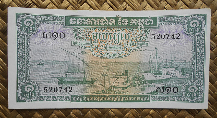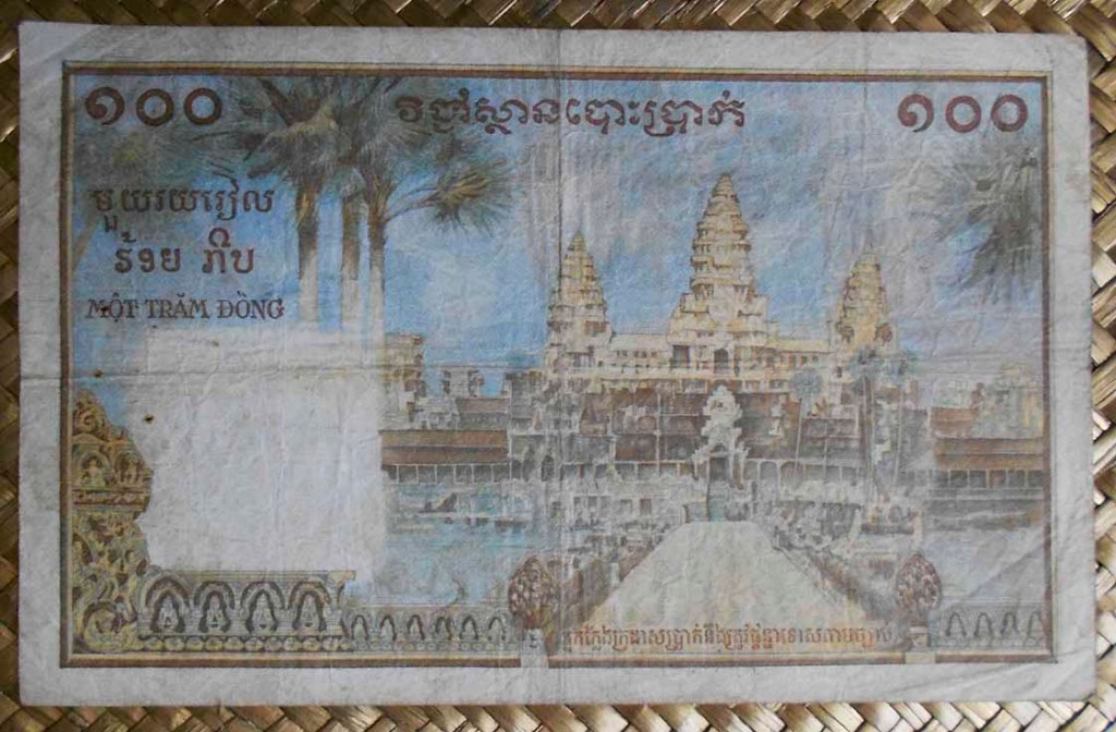 El billete de 100 piastras o riels de Camboya de 1954 lleva las firmas de Gaston Cusin como Le President y de Son Sann como Un Administrateur.