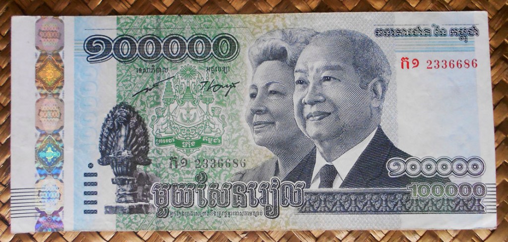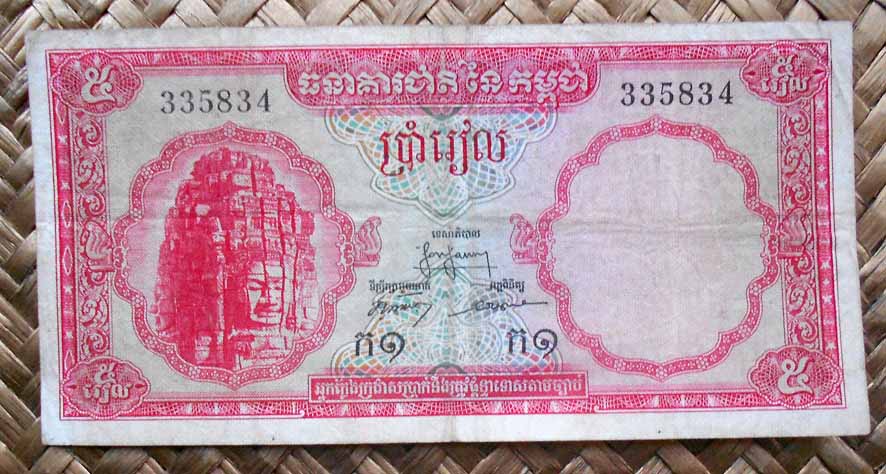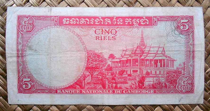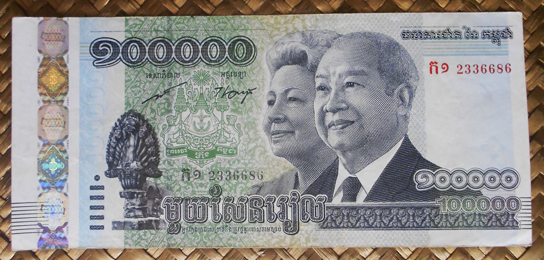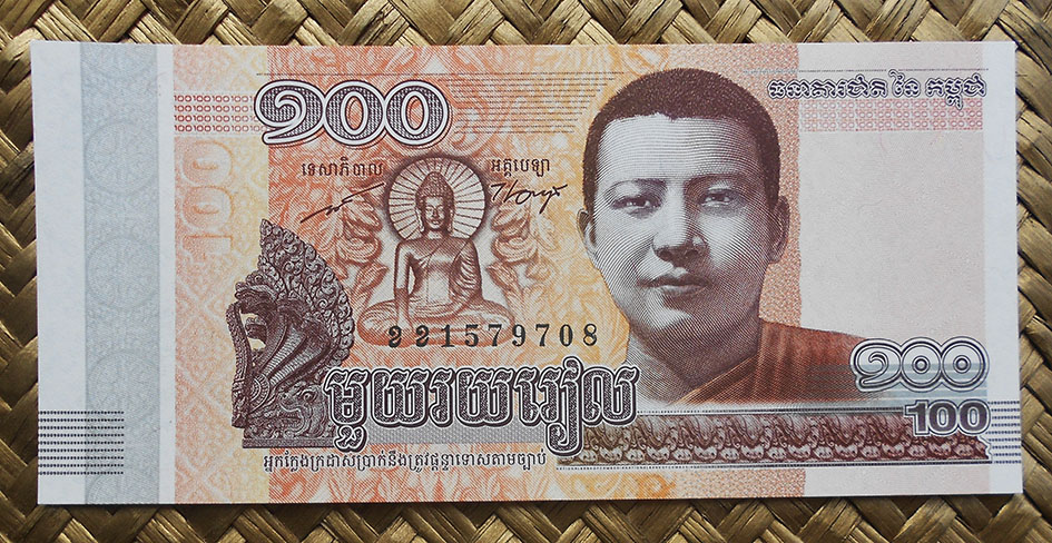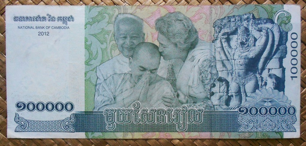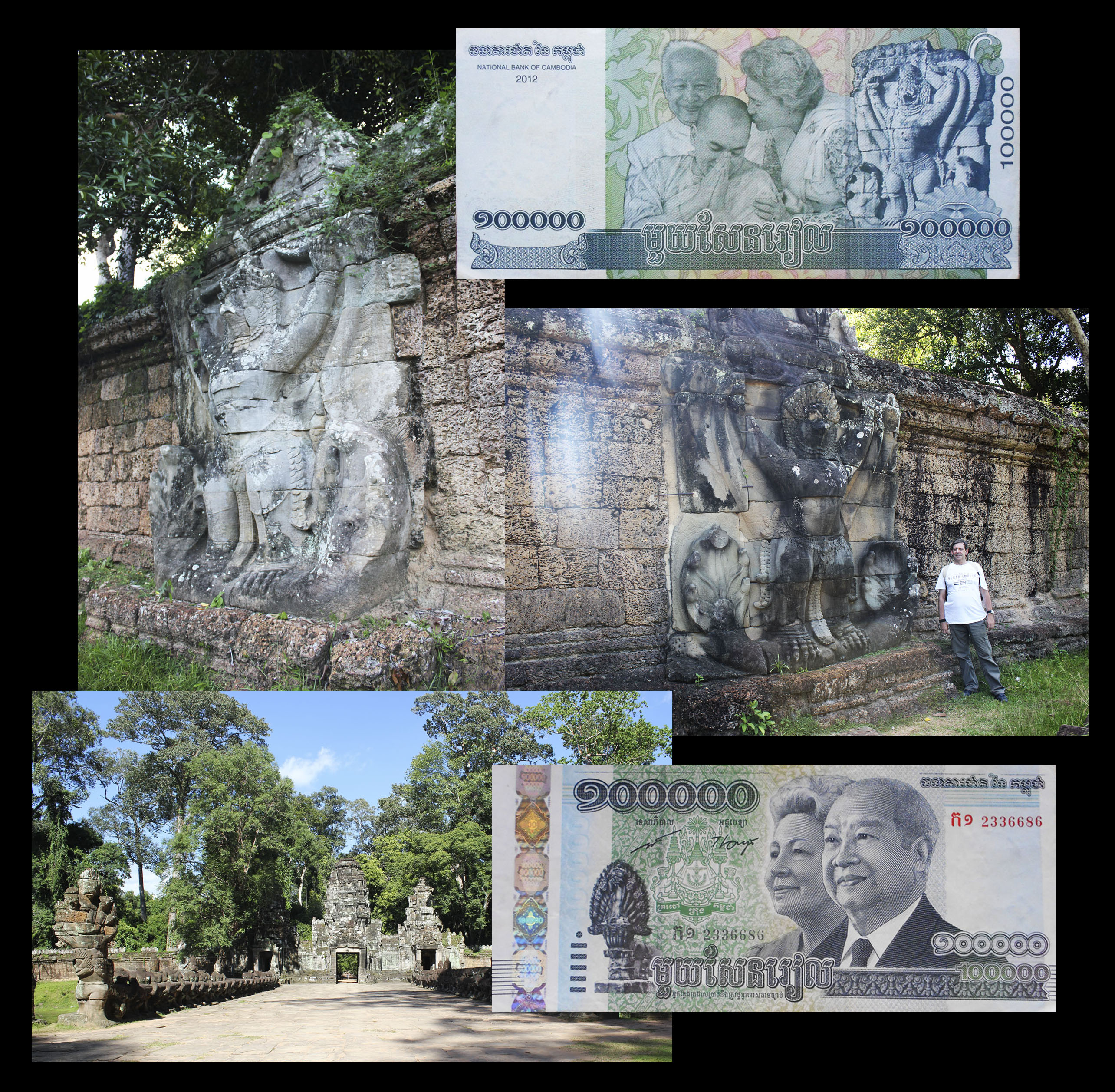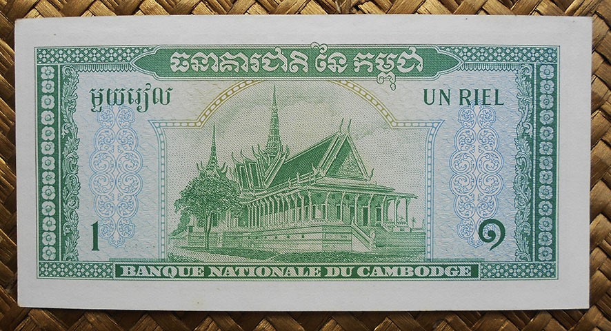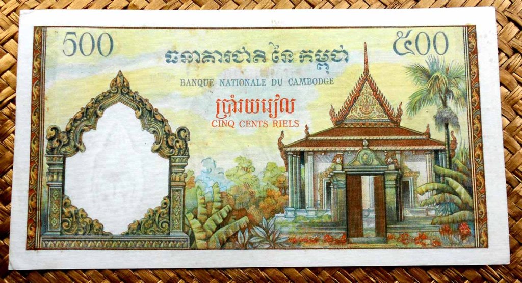 El reverso del ejemplar de Camboya lo ocupa con solemnidad una vista de la entrada al Templo de Angkor Wat en Siem Reap (Camboya). Patrimonio de la Humanidad de la UNESCO desde 1992, está considerada como la mayor edificación religiosa construida. Data del s. XII en pleno apogeo del Imperio Jemer y fue erigido dedicado a los dioses hinduistas Vishnu, Brahma y Shiva.