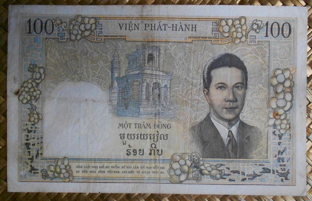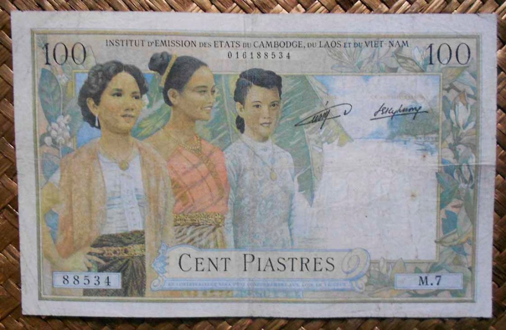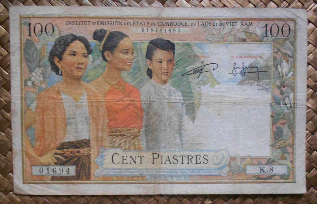 El billete de 100 piastras o dong de Vietnam de 1954 lleva las firmas de Gaston Cusin como Le President y de Nghiem Van Tri como Un Administrateur.