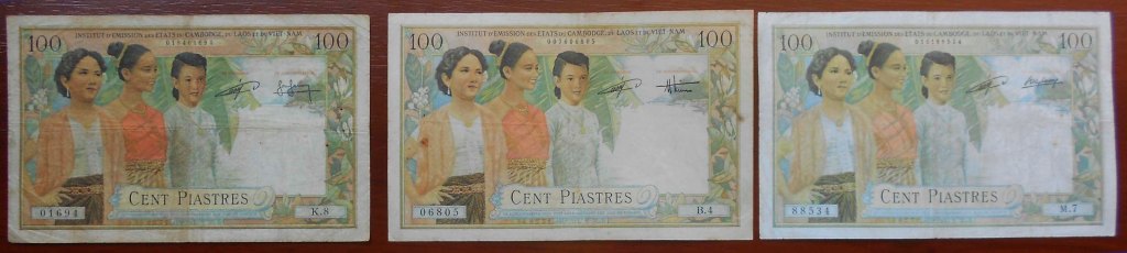 Compararemos las emisiones de 100 rupias (=100 riels) de Camboya de 1954, de 100 rupias (=100 dong) de Vietnam de 1954 y de 100 rupias (=100 kip) de Laos de 1954.