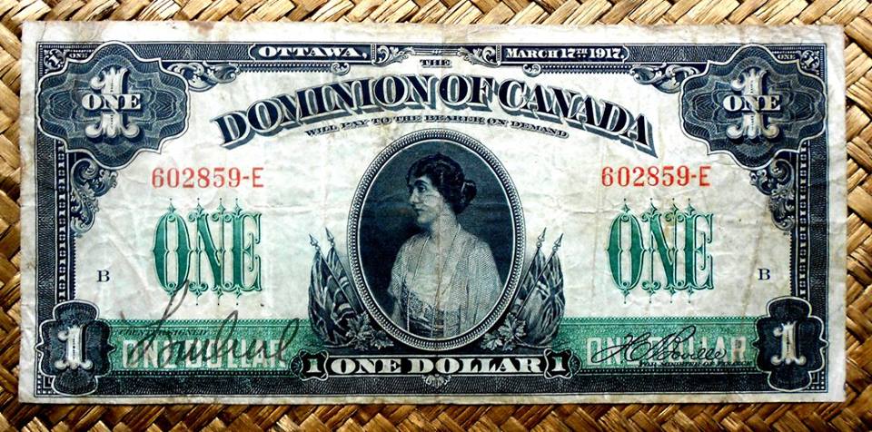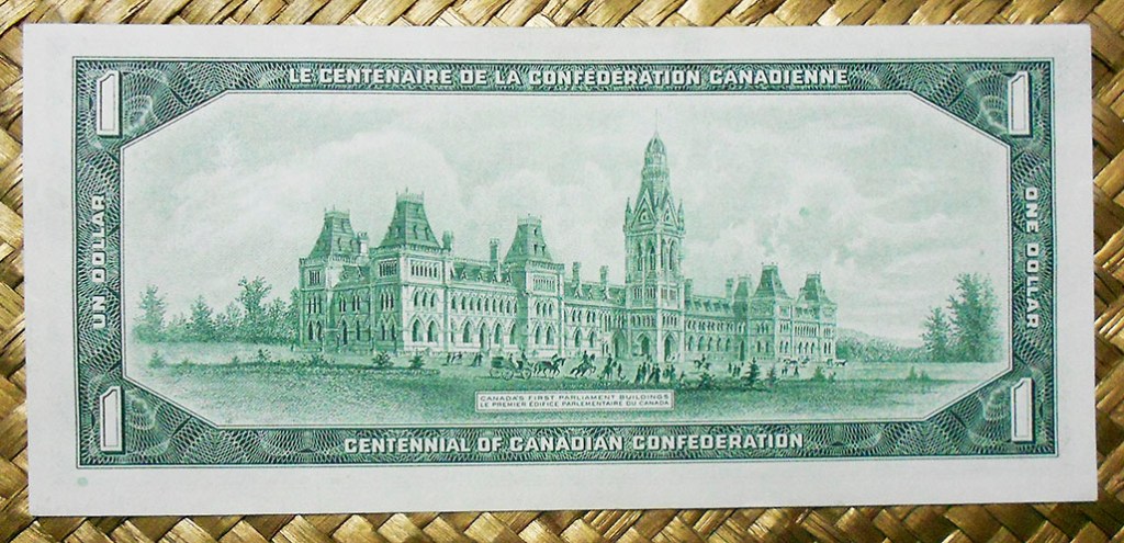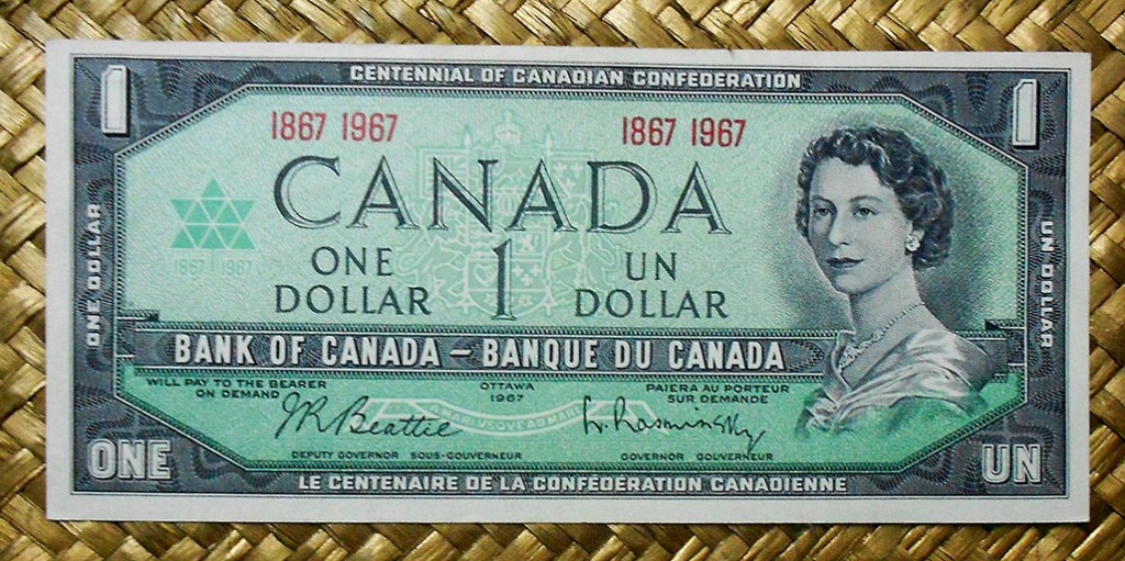 El billete de 1 dólar de Canadá de 1967, editado como conmemorativo del Centenario de la creación de la Confederación de Dominios Canadienses en 1867, se emitió sin nºs de serie. El anverso ofrece el mismo retrato que la edición modificada de 1954, junto al emblema definido para la efeméride, una figura geométrica estrellada con la fecha 1867-1967.