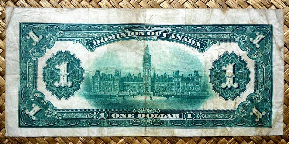 El reverso cambia; no ofrece campos canadienses sino una vista del Edificio sede del Parlamento en Ottawa, tras su reconstrucción en 1916 después de un incendio que afectó significativamente a su edificio central.