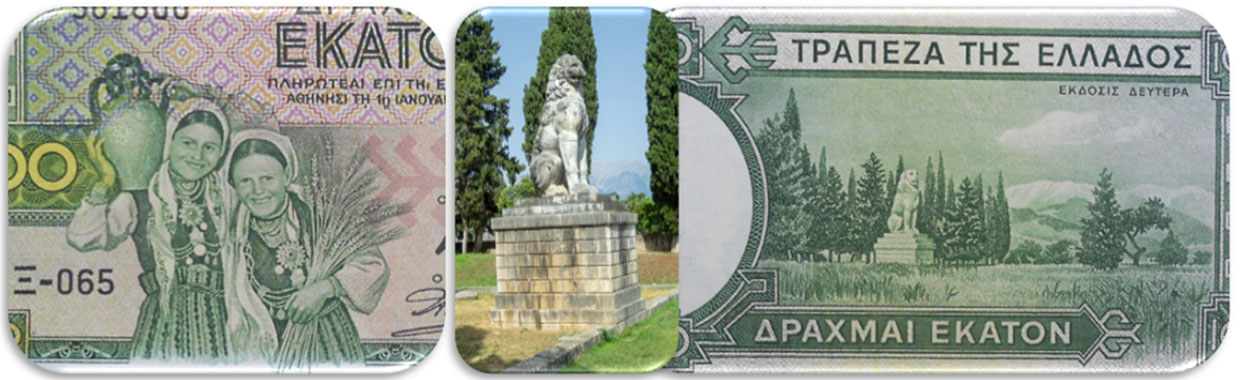 Para los reversos un grabado del prado arbolado de Chaironia donde se encontró la escultura del “León de Chaironia” junto a un enterramiento de 254 soldados tebanos del s. IV adC. La historia nos cuenta que en el s. XIX una excavación de arqueólogos ingleses dio con los restos escultóricos del León de Chaironia, monumento funerario erigido por Tebas para conmemorar a sus soldados muertos en la batalla de Chaironia, que perderían Tebas y Atenas en el 338 adC. frente a los macedonios de Filipo II (padre de Alejandro Magno).