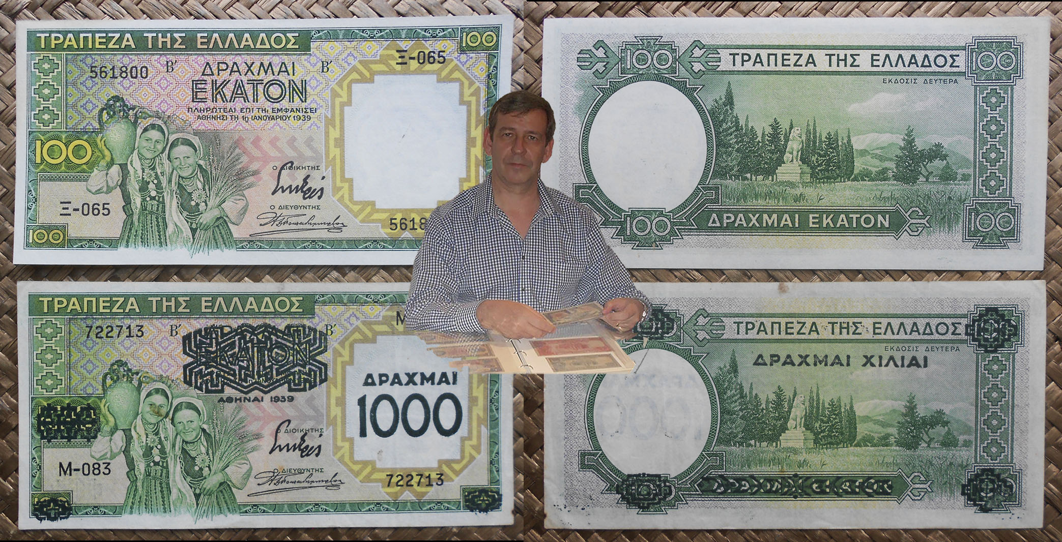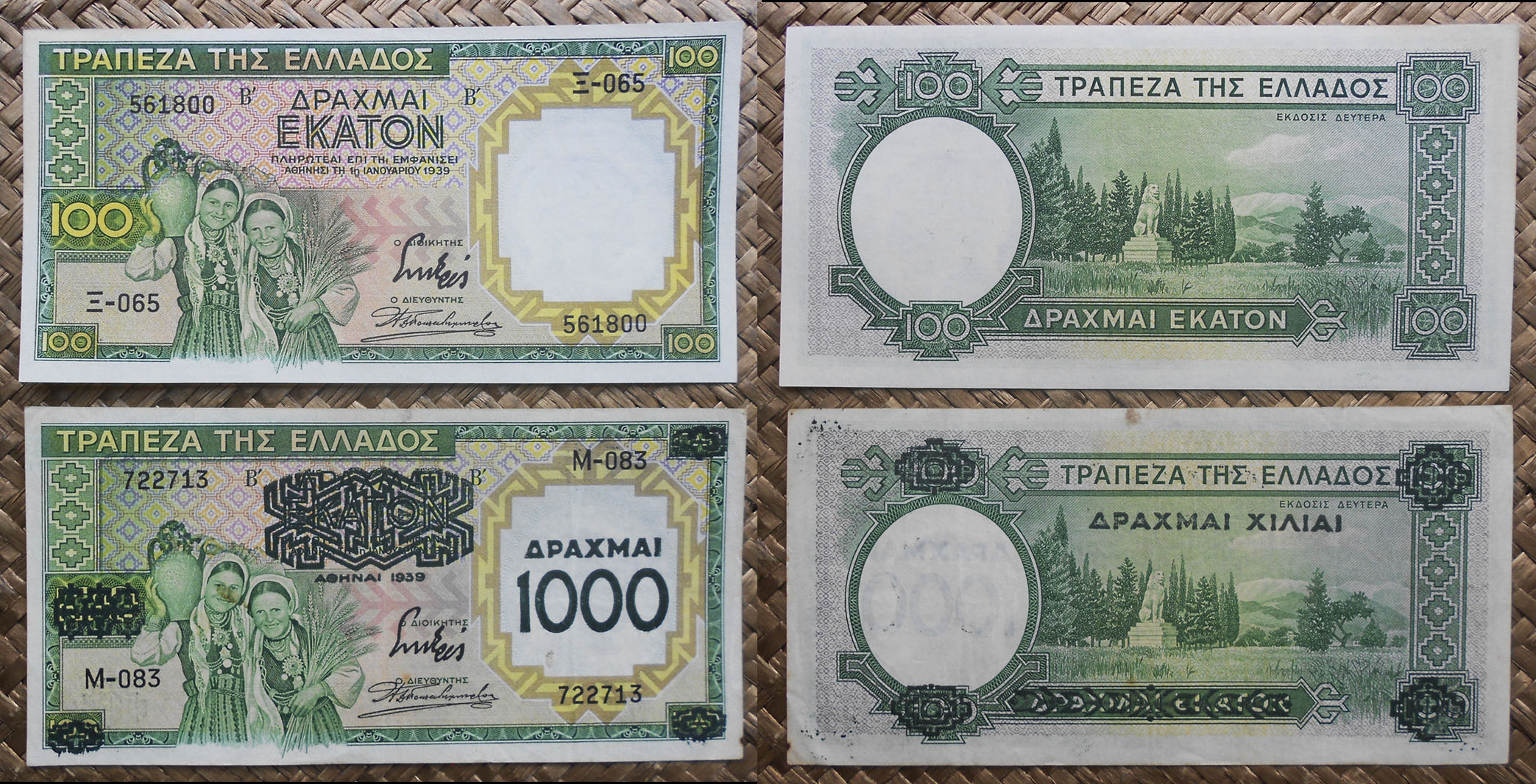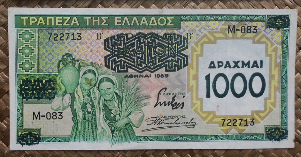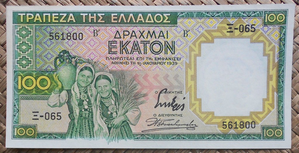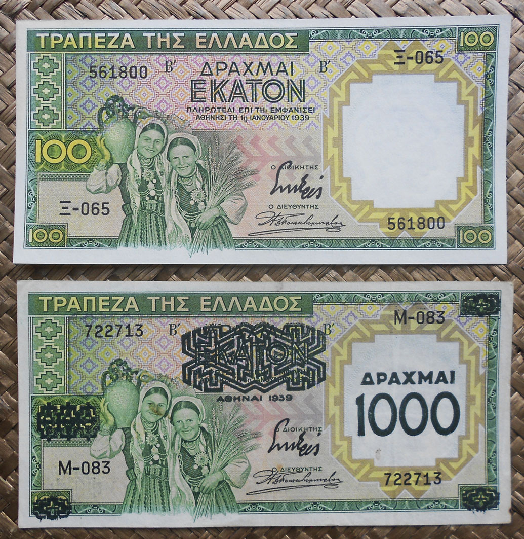 Repasaremos la historia del billete de 100 dracmas de Grecia de 1939, que no circularía como tal sino resellado con un valor diez veces superior. Todo comenzó cuando Grecia encarga a la empresa inglesa Waterlow & Sons la renovación de su billetario entre 50 y 1000 dracmas (50, 100, 500 y 1000). La entrega de los ejemplares de 100 dracmas sufrió un ligero retraso, suficiente para que este valor no pudiese circular como el resto de la emisión. Cuando Grecia fue invadida por los italianos y alemanes la escasez de billetario de gran valor le obligó a resellar estos ejemplares con el valor de 1.000 dracmas, que sacarían a la circulación a mediados de 1941. Por tanto, el billete de 100 dracmas sin resello nunca circuló.