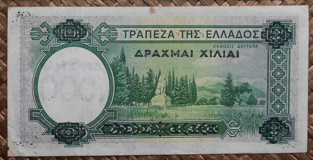 Paradojas del destino, estos billetes no valían 100 dracmas como su imagen mostraba, sino que los que se pusieron en circulación se validaron oficialmente con el resello de 1000 dracmas, por lo que la falsificación estaba servida; comenzaron a surgir resellos falsos para poder utilizarlos como dinero legal nada más el país fuese liberado. Poco duró la aventura, ya que el billete que estamos revisando, tanto con resello legal como manipulado apenas se mantendría en vigor unas semanas.