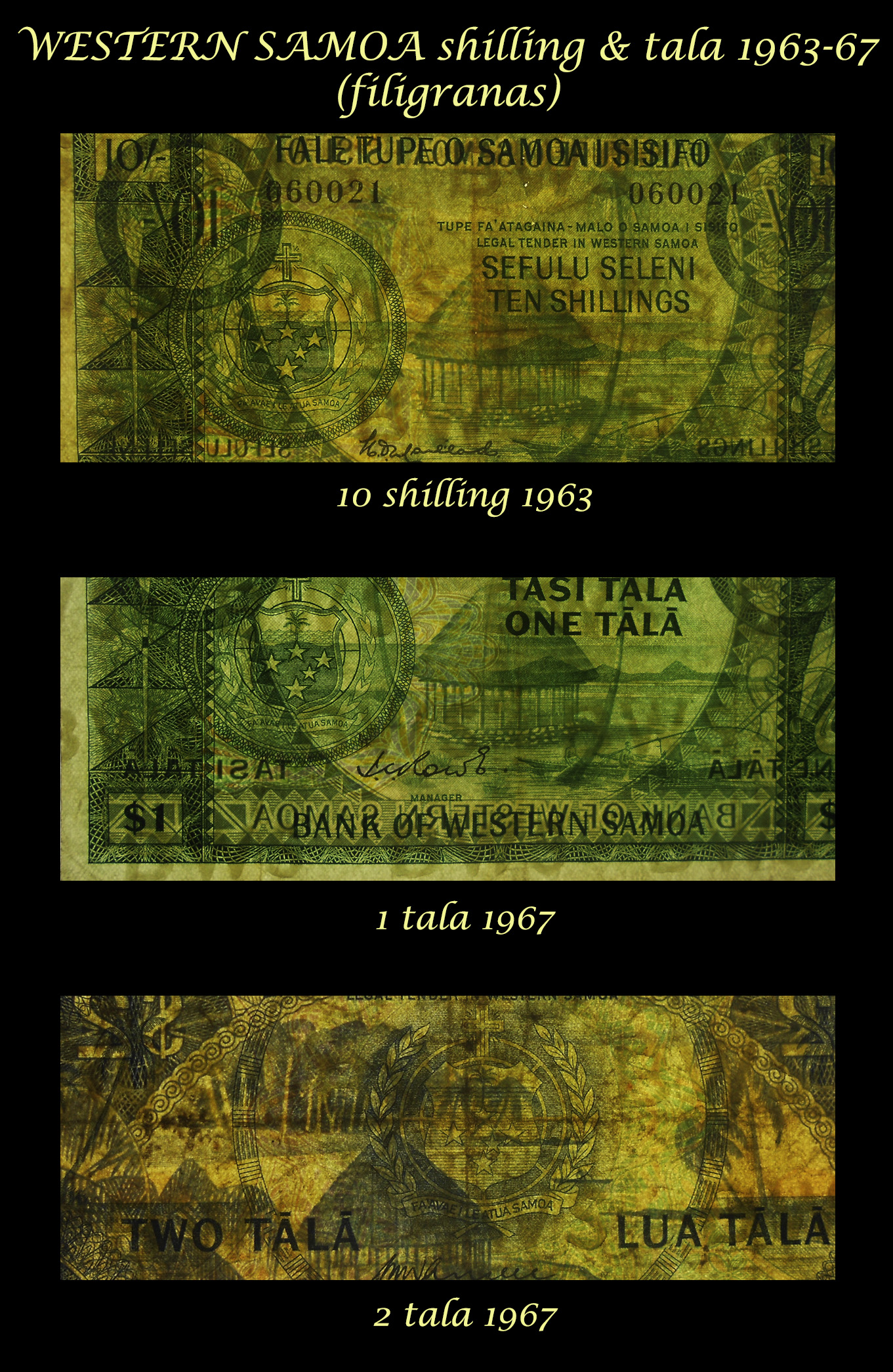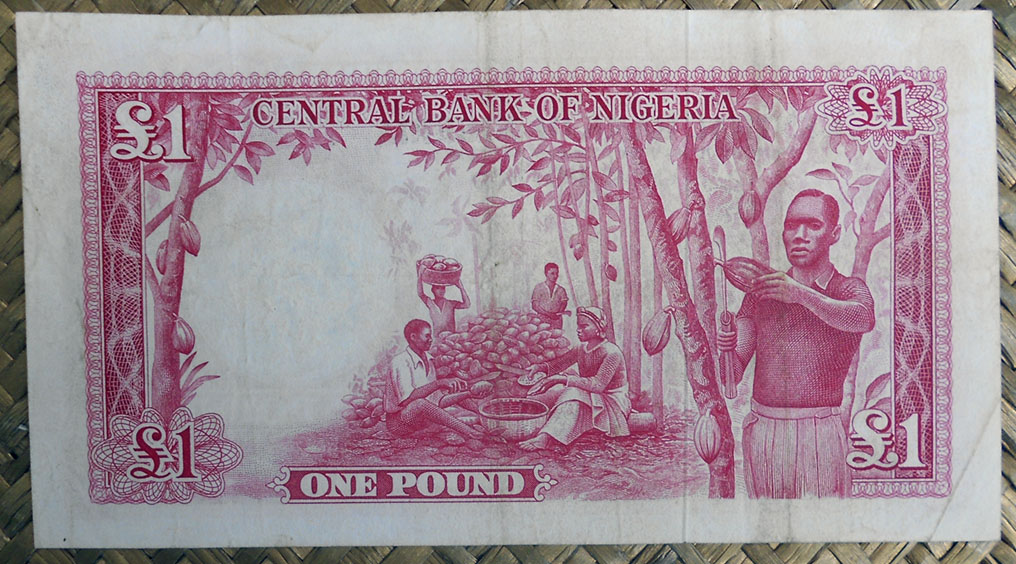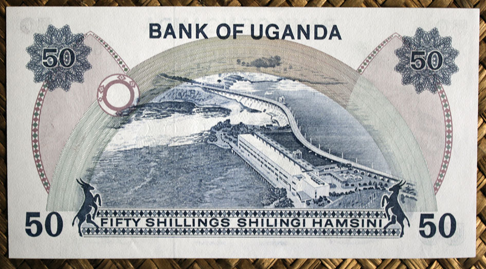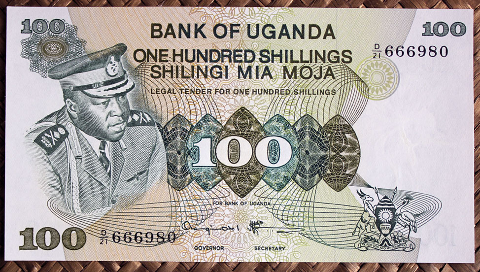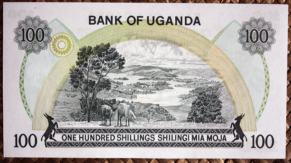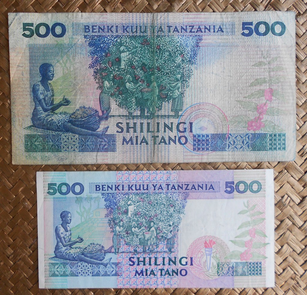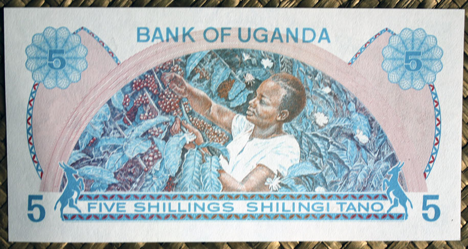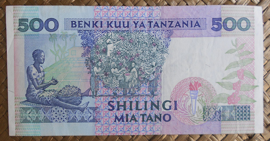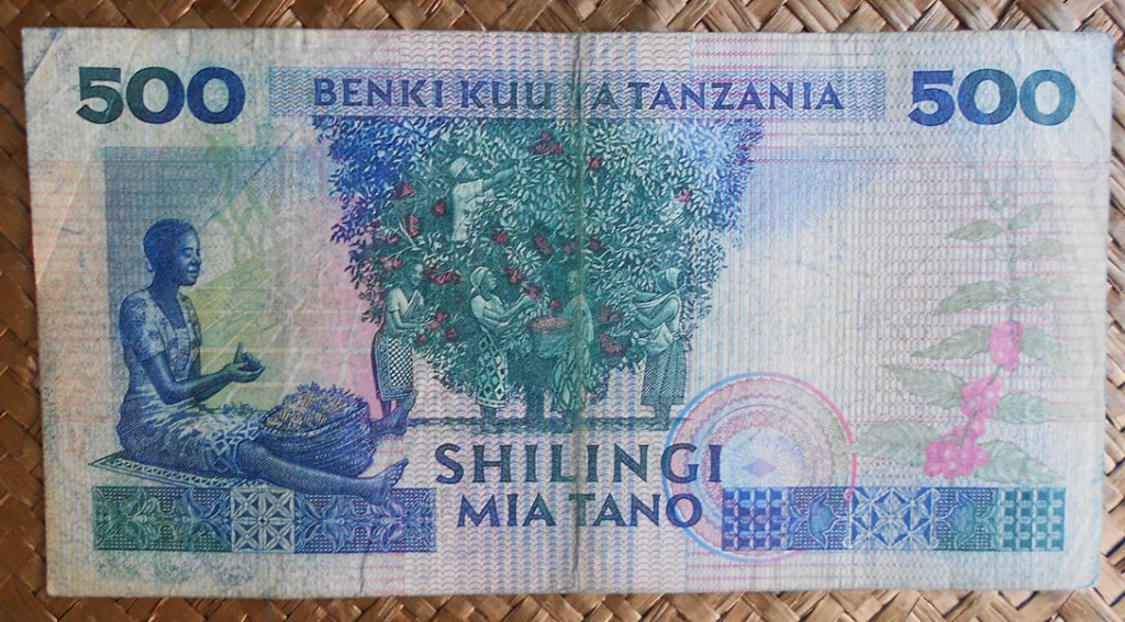El ejemplar de 100 chelines de Tanzania de 1966 nos ofrece al anverso al 1er Ministro Nyerere en cromaticidad rosácea. El círculo de reserva de marca de agua esta vez está rodeado de una corona de ramas con hojas del cafeto en color verde con los granos y flores en blanco y azul rosáceo. Tanzania es el quinto productor de café africano y ocupa el puesto 18º en el ranking mundial.