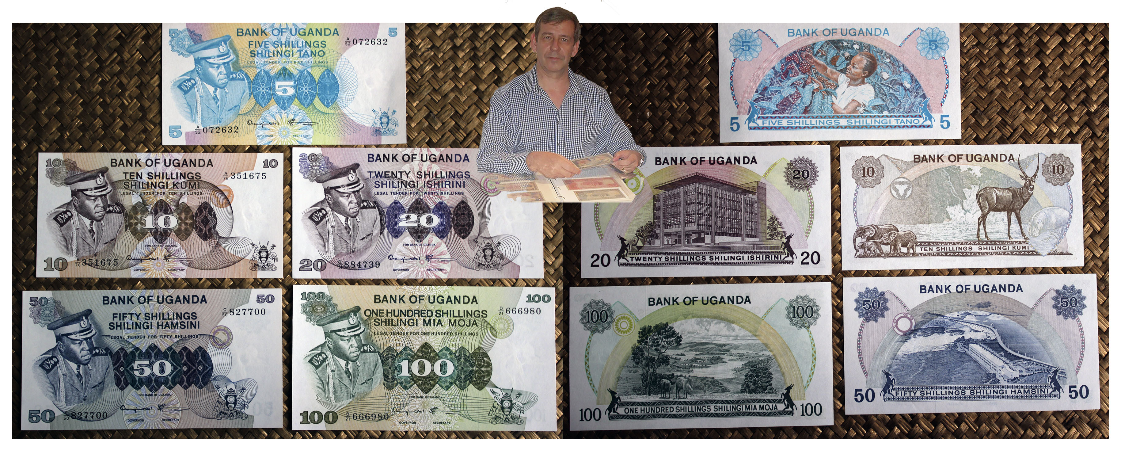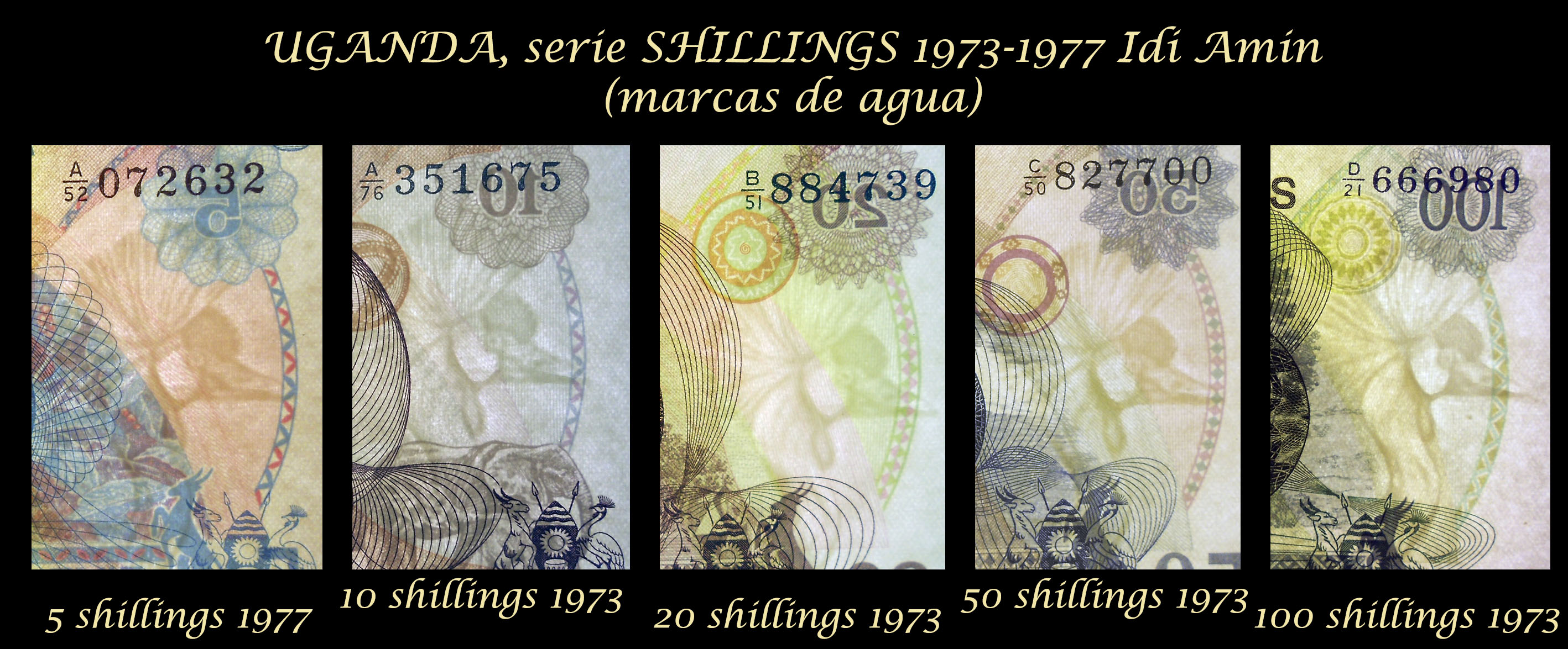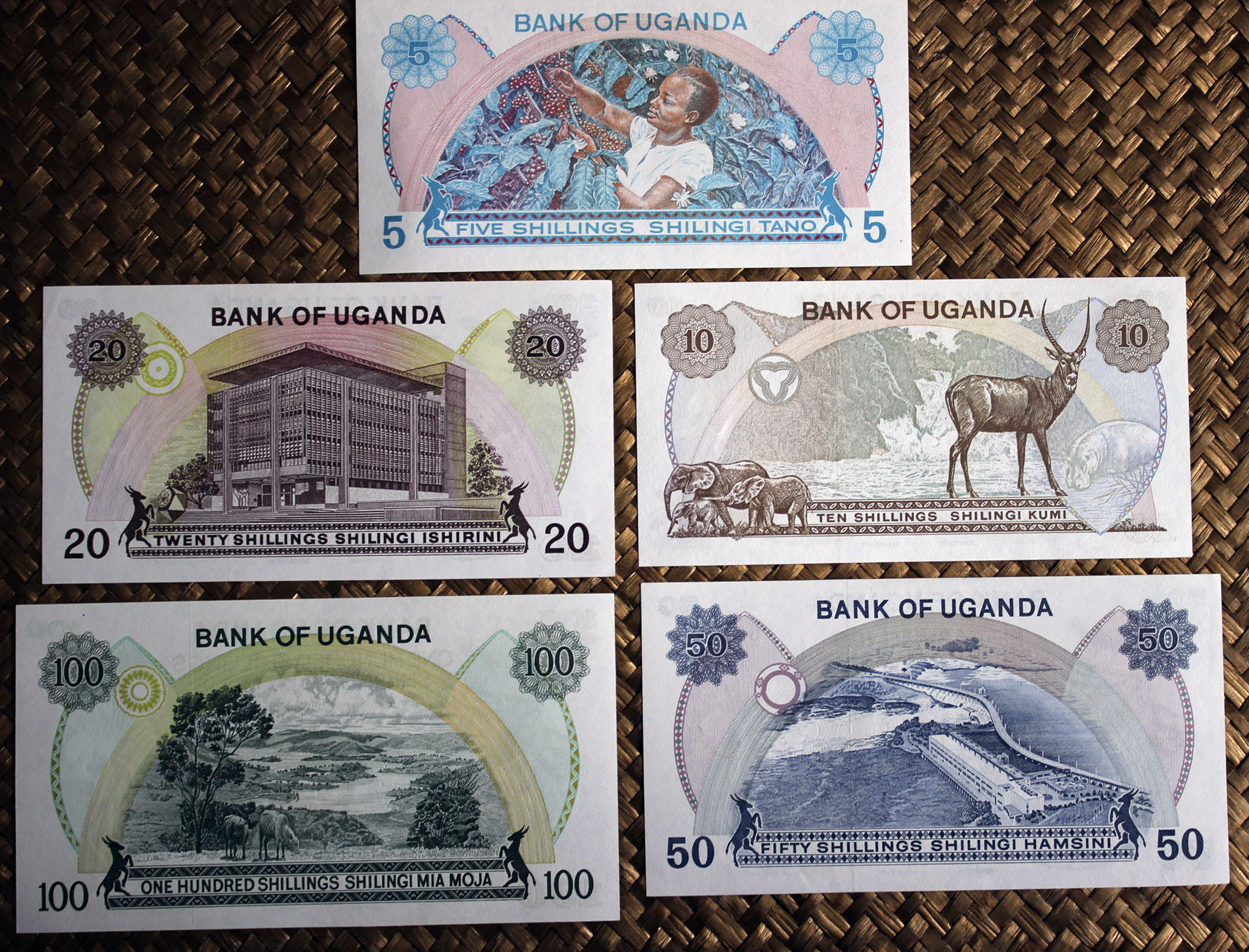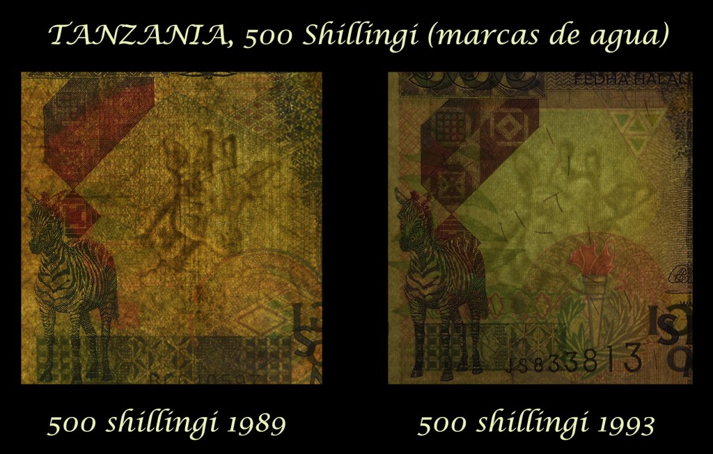 Sus reversos nos muestran la riqueza paisajística y productiva del territorio, desde una magnífica vista del monte Kilimanjaro o plantaciones de sisal, a edificaciones fabriles o la extraordinaria fauna salvaje de su sabana. (Patrimonio natural, agrícola e industrial de un país que comienza a saborear su independencia). Una cartela superior identifica la entidad bancaria en inglés. Al pie los textos del valor de cada ejemplar en suajili y en inglés. El valor en cifra se muestra en dos rosetas diagonales (esquina superior derecha e inferior izquierda).