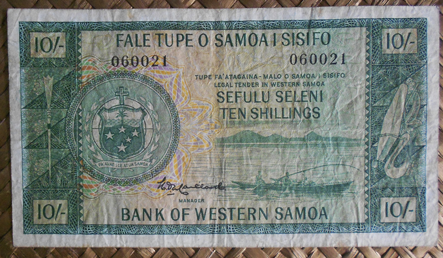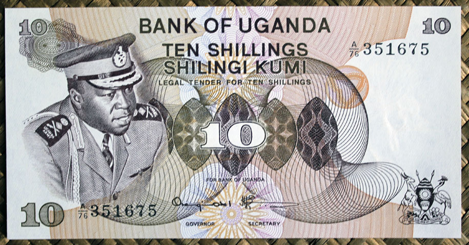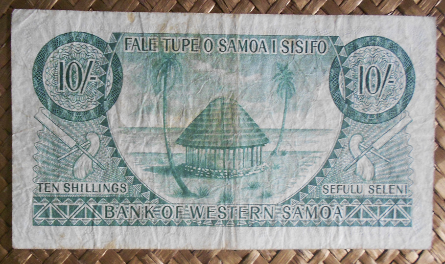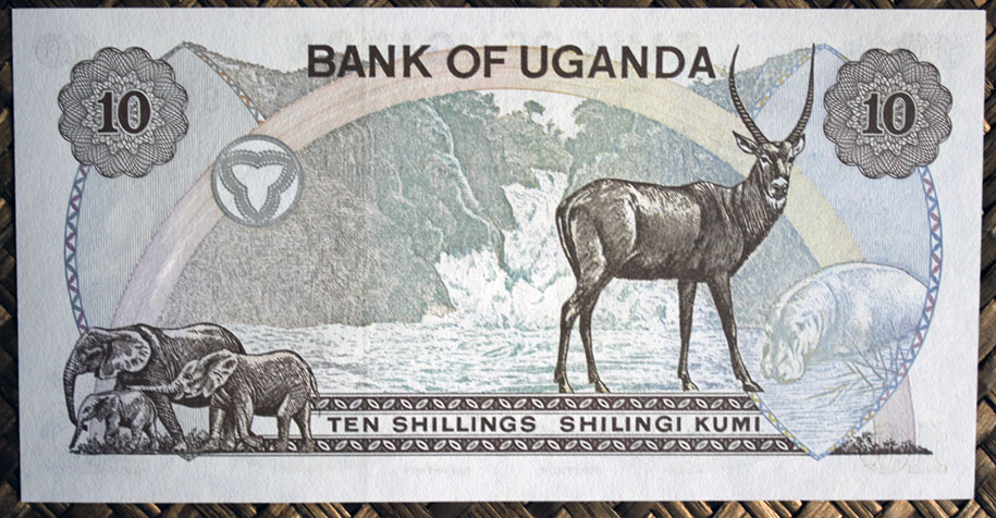 El ejemplar de 10 chelines de Tanzania de 1966 nos ofrece en su anverso al líder Nyerere en cromaticidad verde oscura. El círculo de reserva de marca de agua está flanqueado por una corona de hojas de sisal en color verde. Orlas en marco y textos en color verde oscuro.