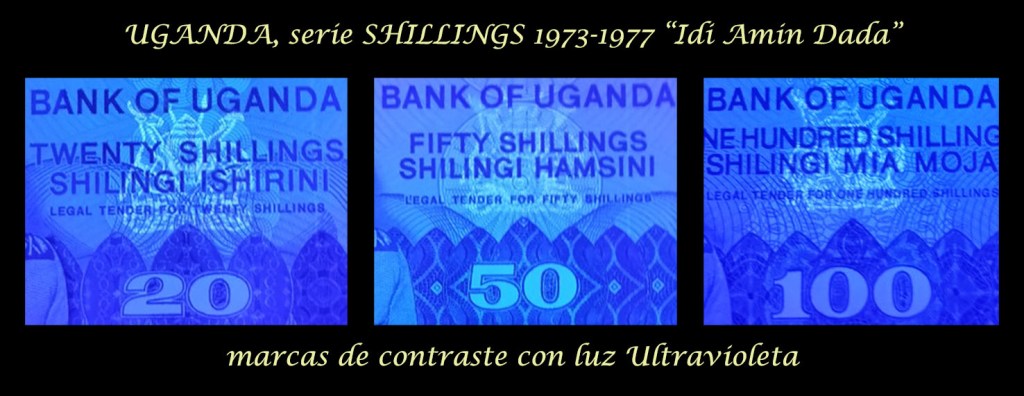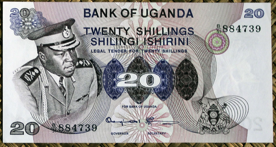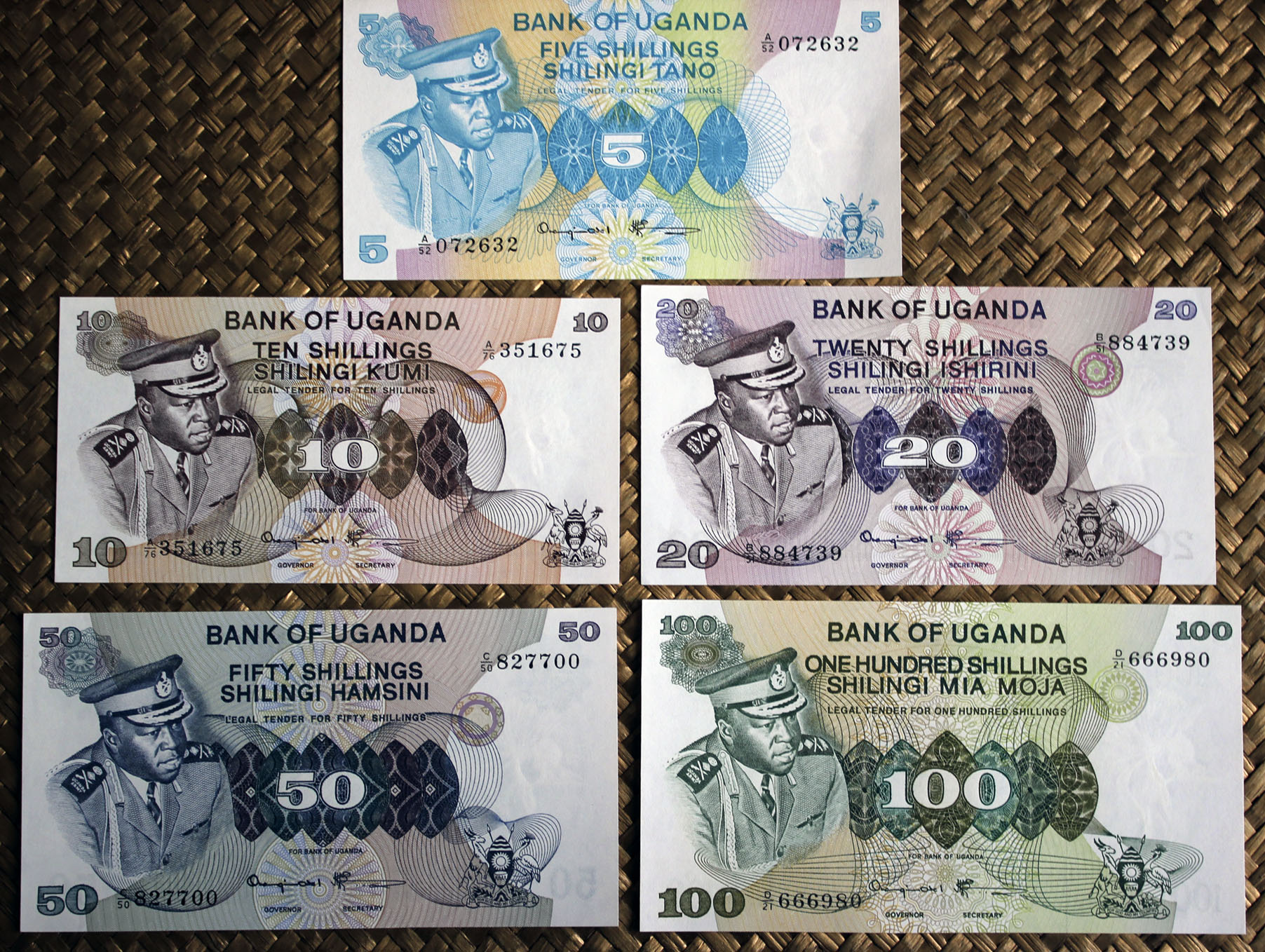 Números de serie en tipografía negra por duplicado y en diagonal (esquina superior derecha e inferior izquierda). Llevan las firmas de Amir Habib Jamal como Minister for Finances y Edwin Mtei como Governor (ejemplares de 5 y 100 sh.) y de Edwin Mtei como Minister for Finances y Charles Nyirabu como Governor (ejemplares de 10 y 20 sh.).