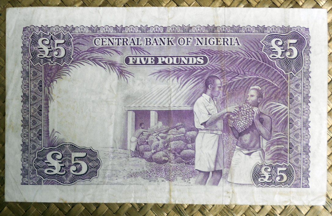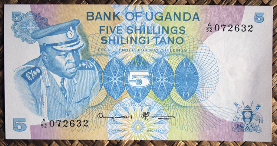 El billete de 5 chelines de Tanzania de 1966 nos muestra en su anverso a Julius Nyerere en cromaticidad amarronada. El círculo de reserva de marca de agua está flanqueado por ramas de margaritas en colores rosáceos, amarillos y azules. Orlas en marco y textos en color marrón.