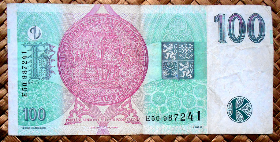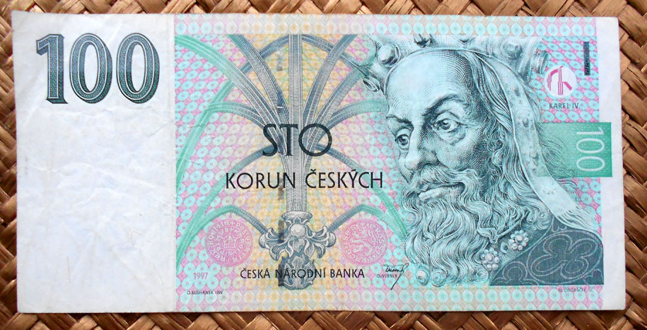 El billete de 100 coronas de 1997 nos presenta al Rey Carlos I de Bohemia y IV de Alemania, emperador del Sacro Imperio entre 1355 y 1378. En su reverso el sello de la Universidad Carolina (s. XIV) de Praga.