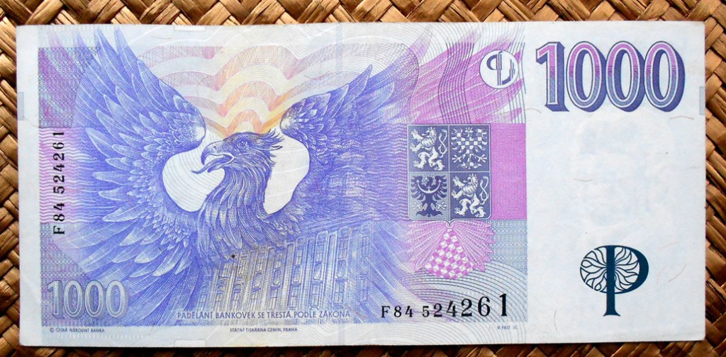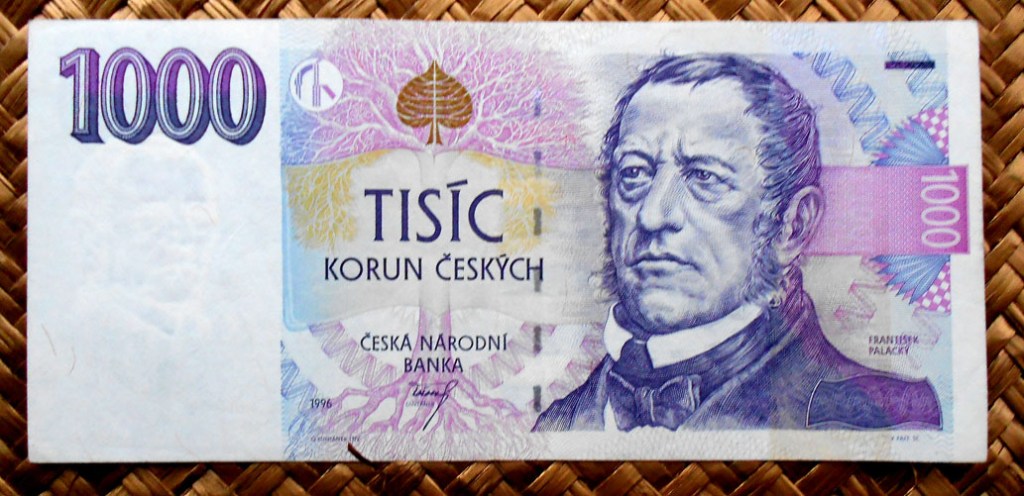 El billete de 1000 coronas de 1996 nos ofrece la imagen de Frantisek Palacky, historiador y político checo del s.XVIII y considerado uno de los tres padres de la nación checa junto a Carlos IV y a Tomas Masaryk (cuya imagen aparece en el billete de 5000 coronas). En su reverso un águila extendiendo sus alas sobre el Castillo arzobispal de Kromeriz (s. XV).
