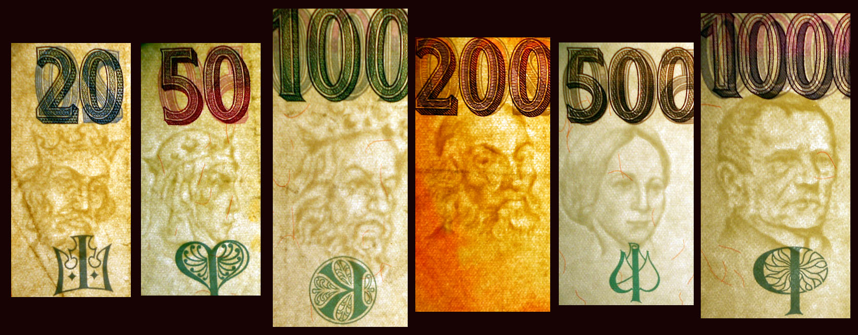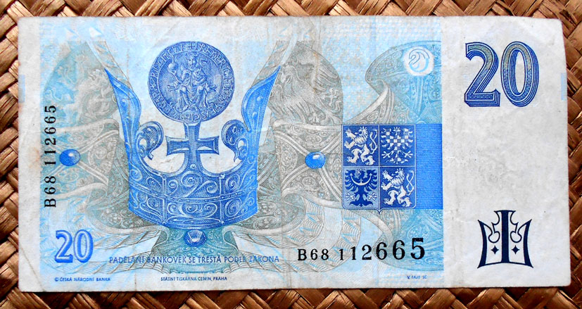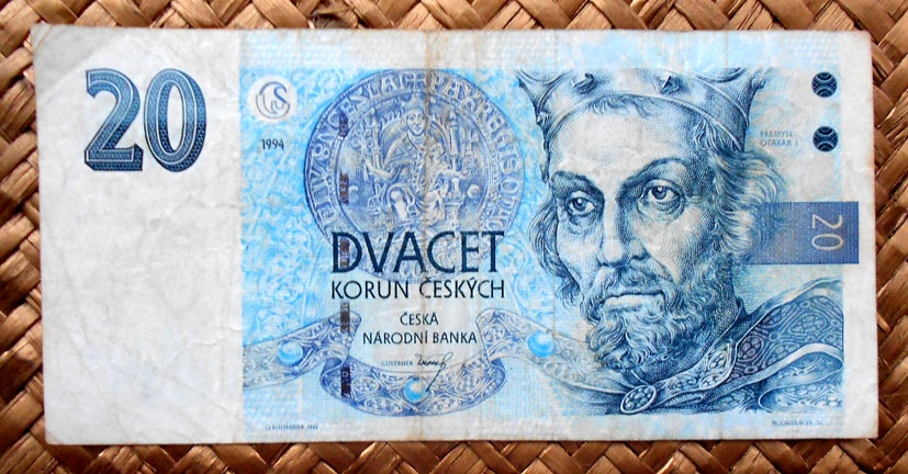 El billete de 20 coronas de 1994 nos muestra en su anverso al Rey Ottakar I, que reinó en Bohemia entre 1198 y 1230. En su reverso, corona funeraria de Ottakar II (Duque de Bohemia del s. XIII y nieto de Ottakar I) y sello aureo del Golden Bull of Sicily («Bula de Oro de Sicilia»; documento del emperador Federico II del Sacro Imperio Romano Germánico otorgando la herencia real para Ottakar II como futuro rey de Bohemia, s. XII)