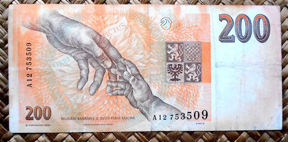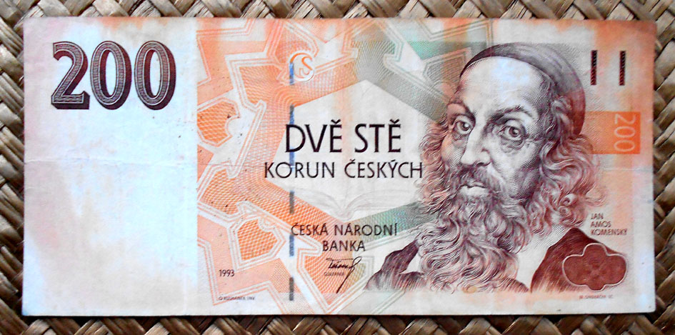 El billete de 200 coronas de 1993 nos muestra a Jan Amos Komensky, filósofo checo del s. XVI conocido como el padre de la Pedagogía, ya que fue quien estableció los principios fundamentales de ésta como ciencia. En su reverso la mano de un adulto se acerca a la mano de un niño, ilustración gráfica del libro Orbis Pictus, de Jan Komensky.