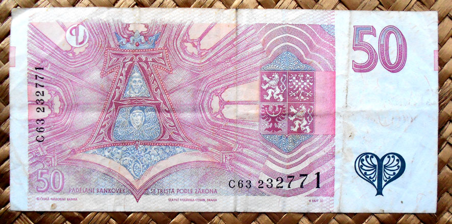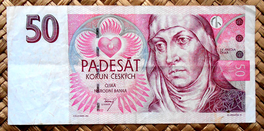 El billete de 50 coronas de 1997 nos ofrece la imagen de Santa Inés de Bohemia, hija de Otakar I que optó por la vida religiosa al renunciar a casarse con el Rey Enrique VII del Sacro Imperio Romano Germánico. Su reverso muestra parte de la cúpula del presbiterio de la Iglesia de San Salvador (parte del Convento de Santa Inés de Bohemia en Praga, del s. XIII) y letra A gótica coronada sobre su dibujo.