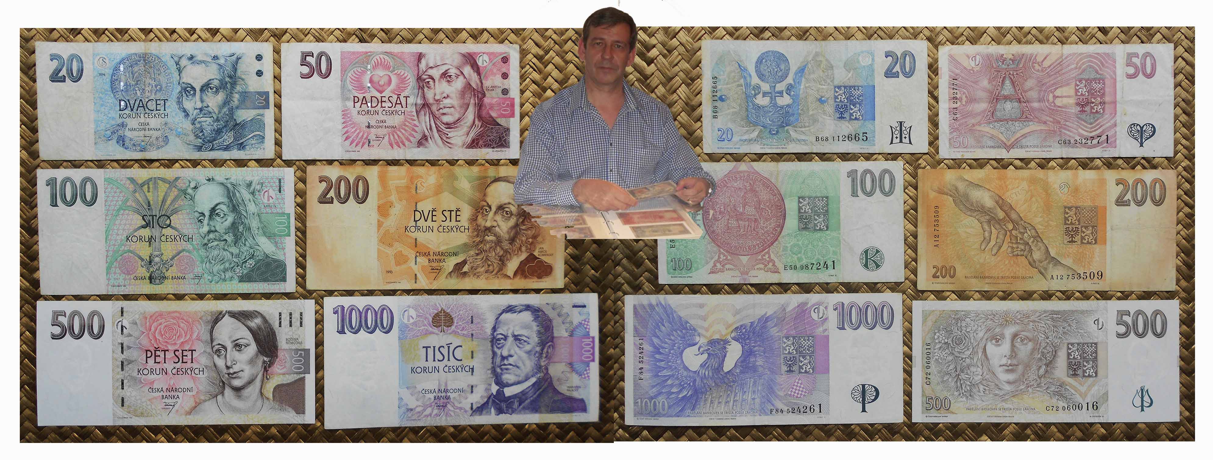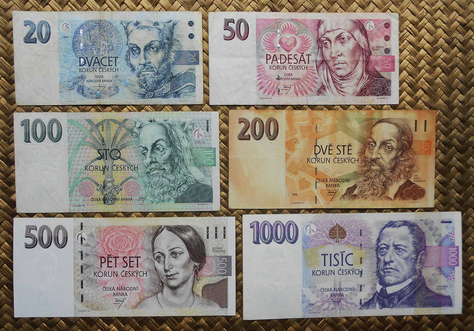 Contemplaremos los ejemplares en coronas que emitieron nada más desaparecer Checoslovaquia como tal en la década de los ’90 del pasado siglo. Os mostraré los billetes de 20, 50, 100, 200, 500 y 1000 coronas (korun).